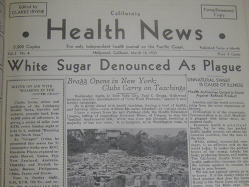 Published by a former Hollywood publicist, Clark Irvine, and later, Godfrey Thomas, some choice headlines from 1933 include "White Sugar Seen as National Menace" and "Beware High Enema: It's Dangerous." Ads from the 1940s include alfalfa tea, vertical traction, cultured Yami yogurt, and Bill Baker's famous Super Soyabread, which is touted as "pure, wholesome, alkaline" made in Ojai, California.