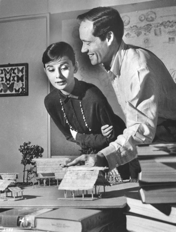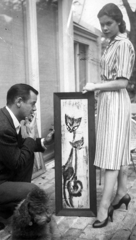 Elizabeth Montgomery and husband Gig Young on the steps of their Laurel Canyon house, consider the perfect place to mount their new Lois Black painting, [1960]. Valley Times Collection