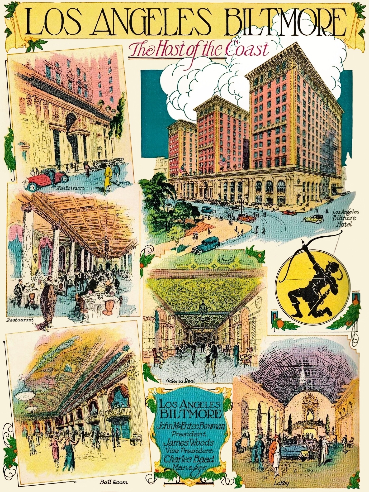 "Los Angeles will rise to the Biltmore, will shed the last trace of its bygone aesthetic and social provincialism, for the Biltmore will indubitably have a profound and lasting effect on the public consciousness. With supernormal expansion, the acorn has become the oak, the pueblo, the city, the city, the metropolis. And in the Biltmore, the metropolis has spawned a lusty child, a child that guarantees through his monster proportions, the future of its sire."