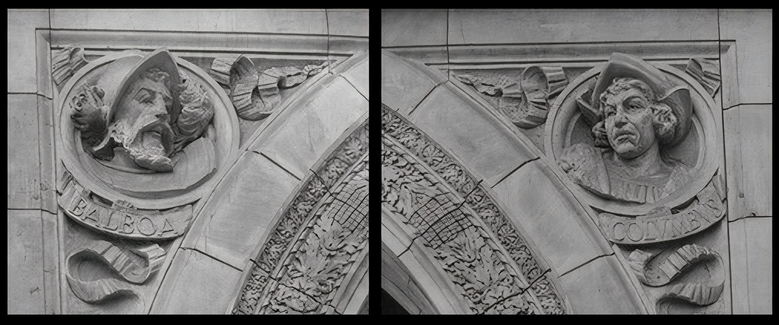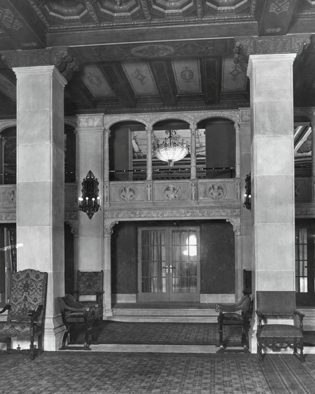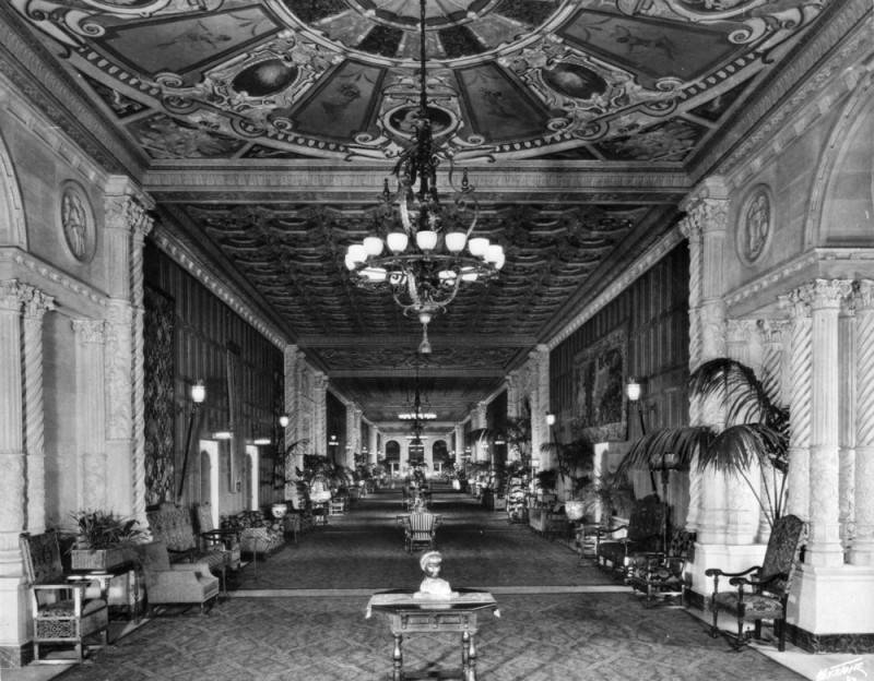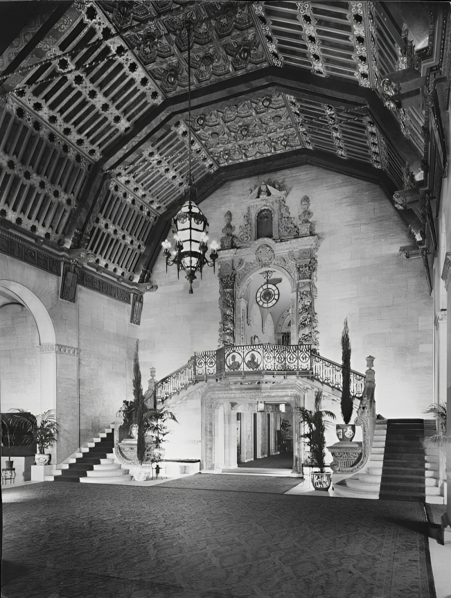 In keeping with the idea that Pershing Square would usher pedestrian traffic into the building, the Olive St. level was considered the "ground floor" while the side closer to Grand Ave. was identified as the "First Mezzanine." The original lobby (now called the Rendezvous Court) is heavily influenced by Moorish Spain and Italian Renaissance architecture with beige travertine stone walls capped by hand-carved beams sitting more than three stories high. Both the ceiling and beams have hand-painted adornments that include 24-karat gold accents. The bronze staircase at the western end of the room leads to an elaborate altar-like archway that flows into the Galeria Real. The top of the staircase is girded by bronze reliefs of the Roman goddess Ceres (left) and Spanish Conquistador Vasco Nunez de Balboa (right). Antony Anderson of the Times described it as "modeled after a fine old room in a Spanish castle, the influence decidedly Moorish." "Spanish" motifs can, in fact, be found throughout the hotel including reliefs featuring Queen Isabella, Christopher Columbus, and other "explorers" while coats of arms, described as 'Spanish' in promotional literature of the time, appear throughout the building. To the right of the original lobby was the "Men's Lounge," which was described as "a reproduction of the royal hall in which Queen Isabella first learned from the intrepid Christopher Columbus of the existence of America." An illuminated globe modeled after one allegedly created by Leonardo DaVinci dangled from the center of the room while the ceiling surrounding the globe was decorated with panels depicting Spanish conquistadors like Hernan Cortez and Vasco Nunez de Balboa. The entire interior was saturated in a rich Spanish Baroque style that remains captivating even to those who have seen it before.