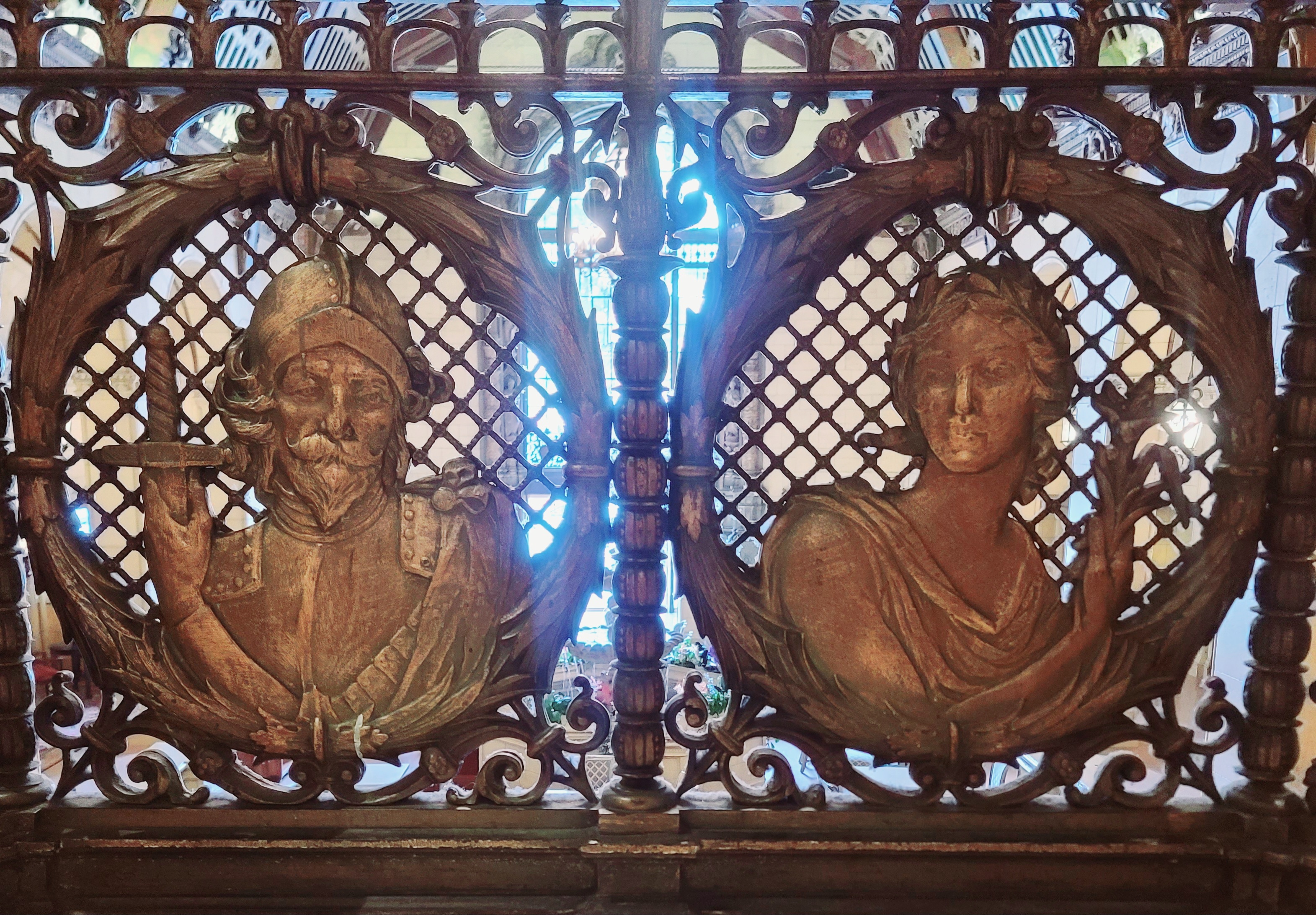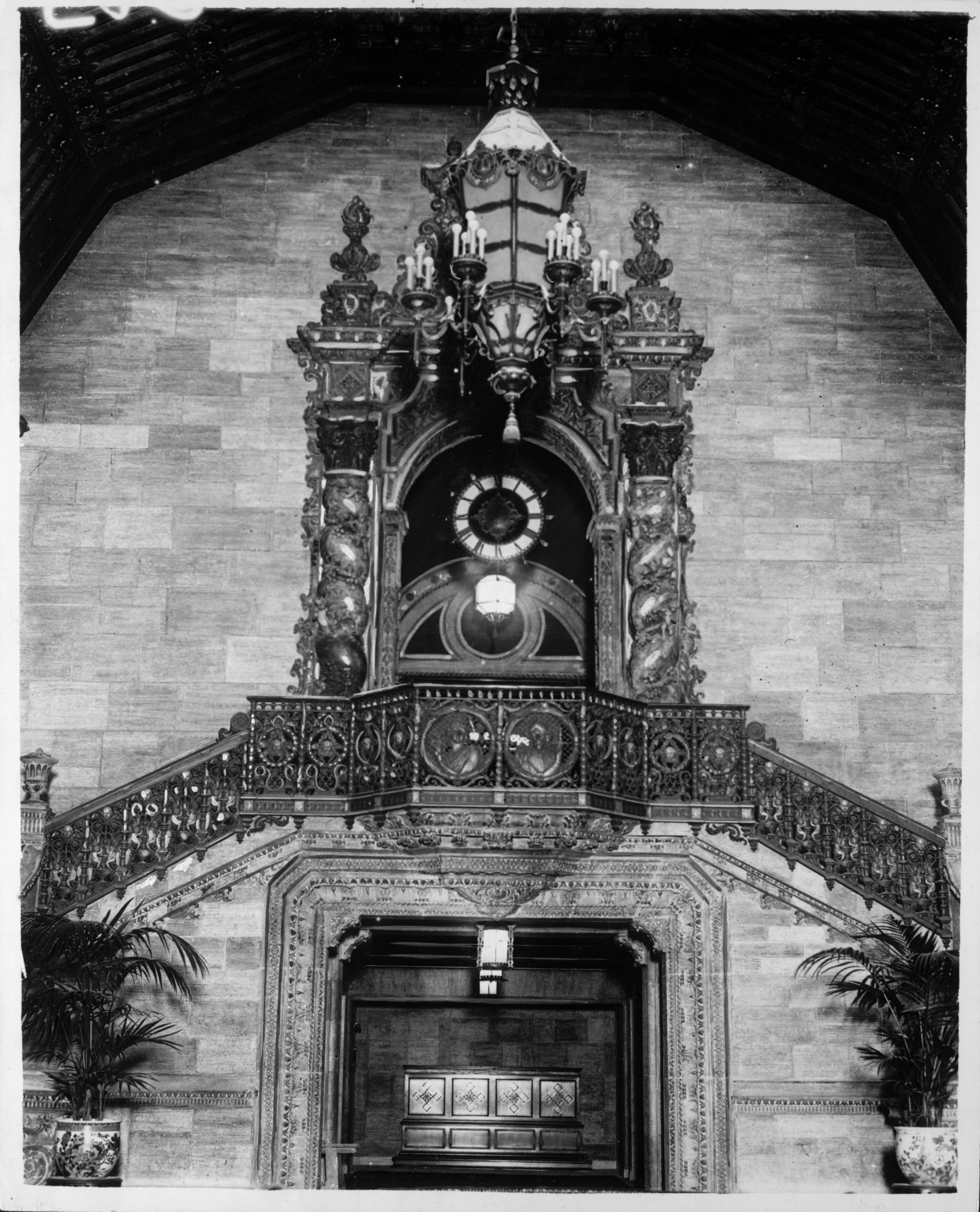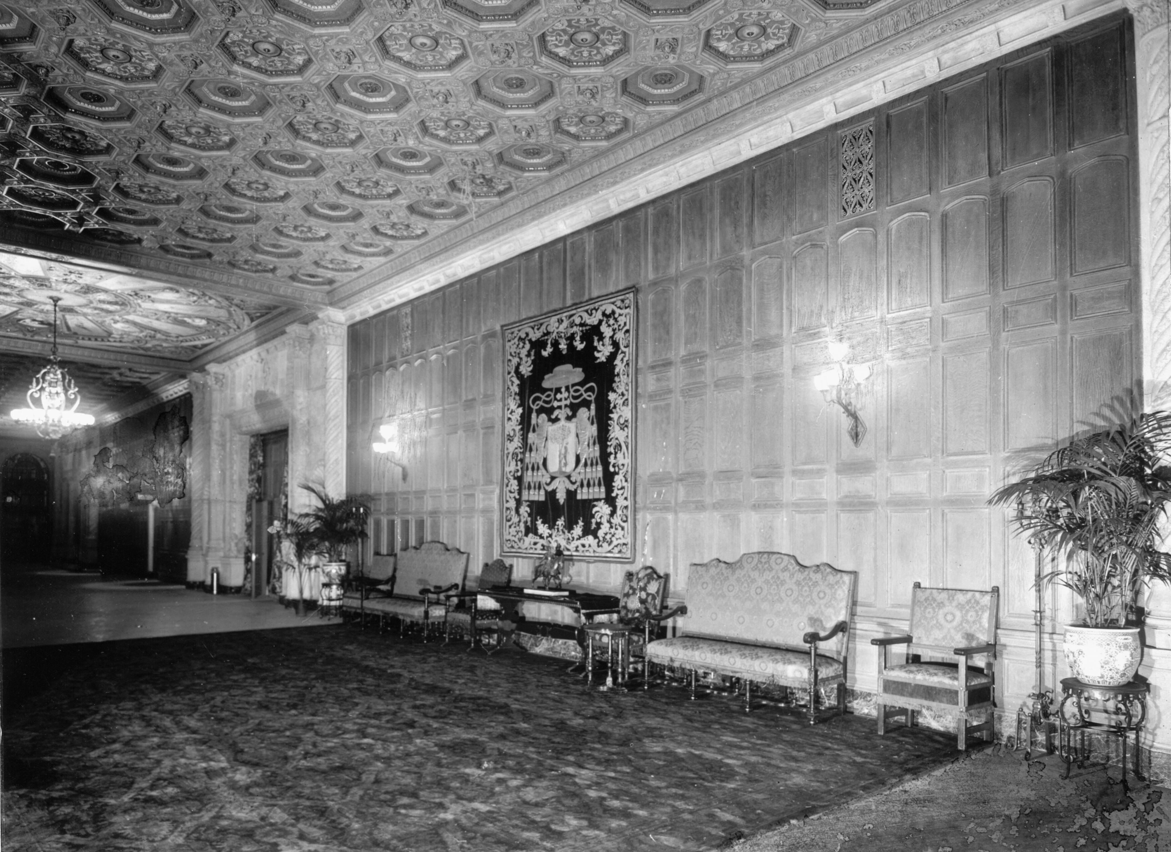 In keeping with the idea that Pershing Square would usher pedestrian traffic into the building, the Olive St. level was considered the "ground floor" while the side closer to Grand Ave. was identified as the "First Mezzanine." The original lobby (now called the Rendezvous Court) is heavily influenced by Moorish Spain and Italian Renaissance architecture with beige travertine stone walls capped by hand-carved beams sitting more than three stories high. Both the ceiling and beams have hand-painted adornments that include 24-karat gold accents. The bronze staircase at the western end of the room leads to an elaborate altar-like archway that flows into the Galeria Real. The top of the staircase is girded by bronze reliefs of the Roman goddess Ceres (left) and Spanish Conquistador Vasco Nunez de Balboa (right). Antony Anderson of the Times described it as "modeled after a fine old room in a Spanish castle, the influence decidedly Moorish." "Spanish" motifs can, in fact, be found throughout the hotel including reliefs featuring Queen Isabella, Christopher Columbus, and other "explorers" while coats of arms, described as 'Spanish' in promotional literature of the time, appear throughout the building. To the right of the original lobby was the "Men's Lounge," which was described as "a reproduction of the royal hall in which Queen Isabella first learned from the intrepid Christopher Columbus of the existence of America." An illuminated globe modeled after one allegedly created by Leonardo DaVinci dangled from the center of the room while the ceiling surrounding the globe was decorated with panels depicting Spanish conquistadors like Hernan Cortez and Vasco Nunez de Balboa. The entire interior was saturated in a rich Spanish Baroque style that remains captivating even to those who have seen it before.