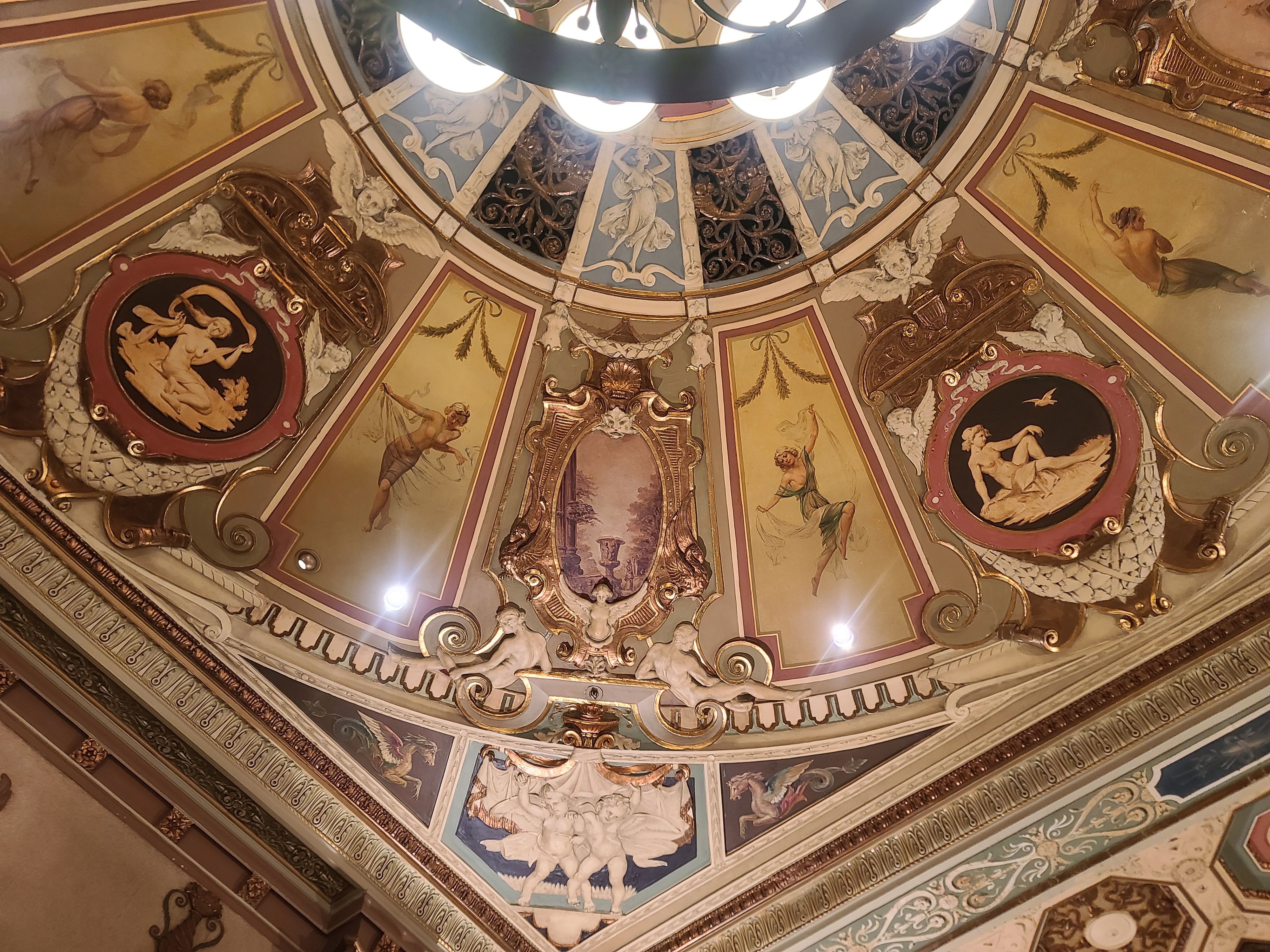 The Ballroom, described in a 1923 Times article, is "spacious ballroom with its foyer large enough to also be used for dancing has a specially designed and laid out floor of maple. The walls are of marble, stone, and plaster, hung with draperies. A gallery runs around the four sides." This practical, rather unsentimental description undermines one of the city's most beautiful interior spaces. The Ballroom is one of the few spaces that hasn't changed much since 1923 and remains as stunning as the day it debuted. At 6300 square feet and two stories high, the Ballroom is one of the largest spaces in the hotel and, arguably, the most extravagant. Nearly every corner of the room has some sort of adornment making it impossible to fully appreciate the artistry in a single visit. The original floor was constructed from maple but now appears to be covered by custom carpeting that has, no doubt, protected the original floors from decades of wear and tear. A series of second-story balconies establish a gallery along the periphery giving the feeling of a European opera house. Three oversized windows reside along the east wall of the hotel, overlooking Pershing Square; today, it's evident why the hotel would want to keep the curtains drawn but, in 1923 with a spectacular view of John Parkinson's urban oasis, guests would have reassured that Los Angeles was a cosmopolitan city. Intricate, gilded crown molding draws attention to the domed ceiling that supports two sparkling Austrian crystal chandeliers. Surrounding these chandeliers are masterful renaissance-styled artwork depicting an assortment of nymphs, satyrs, and cherubs that surround goddesses in diaphanous attire. Elaborate garland leads the eye to these focal points, highlighting this masterful artwork that resides on a single sheet of canvas. Times writer Antony Anderson wrote that the inspiration was the ceilings of "palaces in Florence." This particular masterpiece took seven months to complete and represents some of the finest work from an artist whose genius can be seen throughout some of Los Angeles' most venerated spaces.