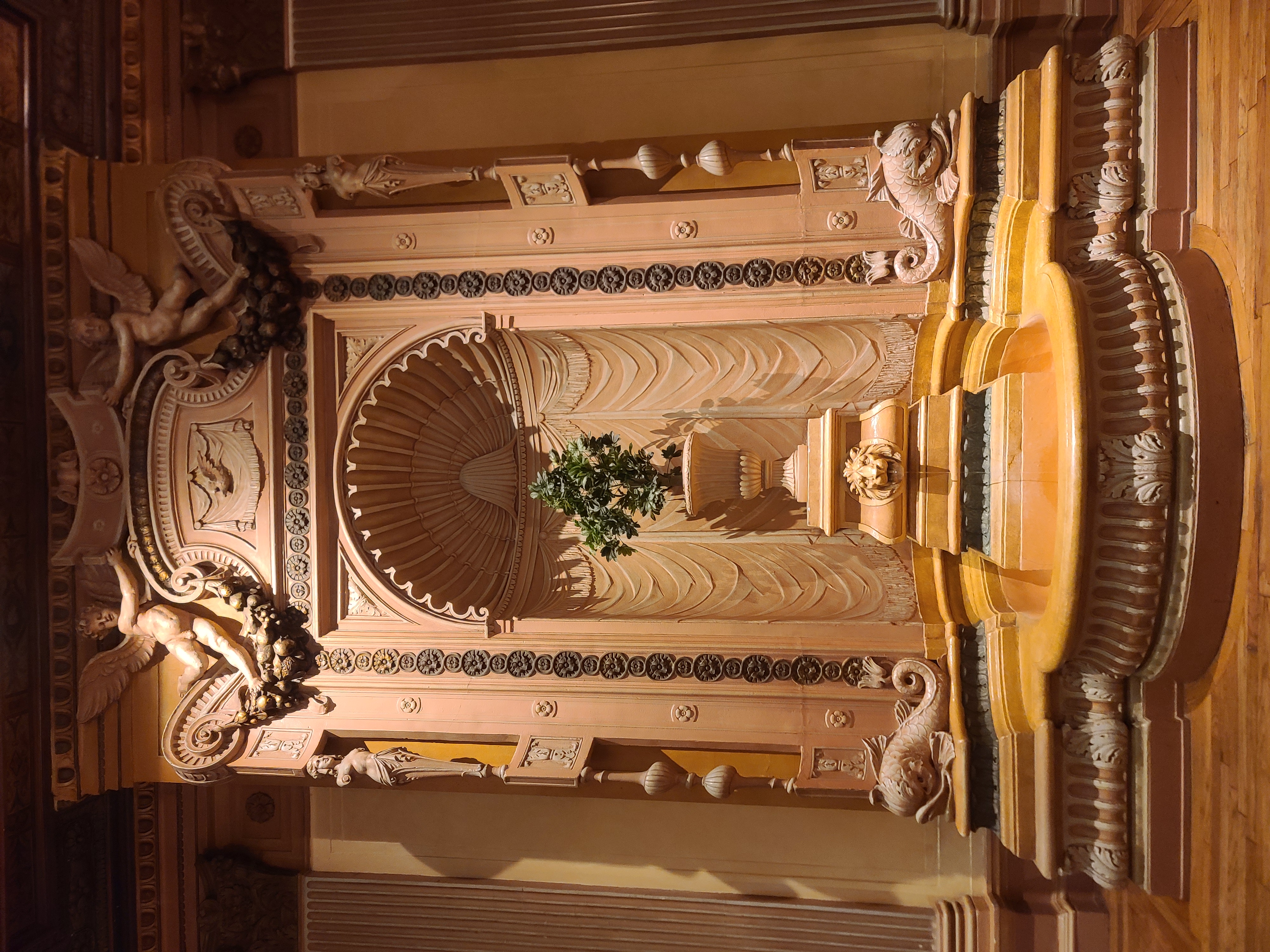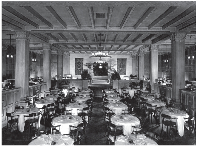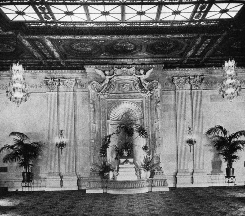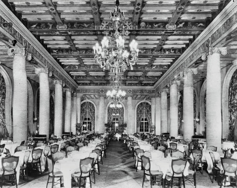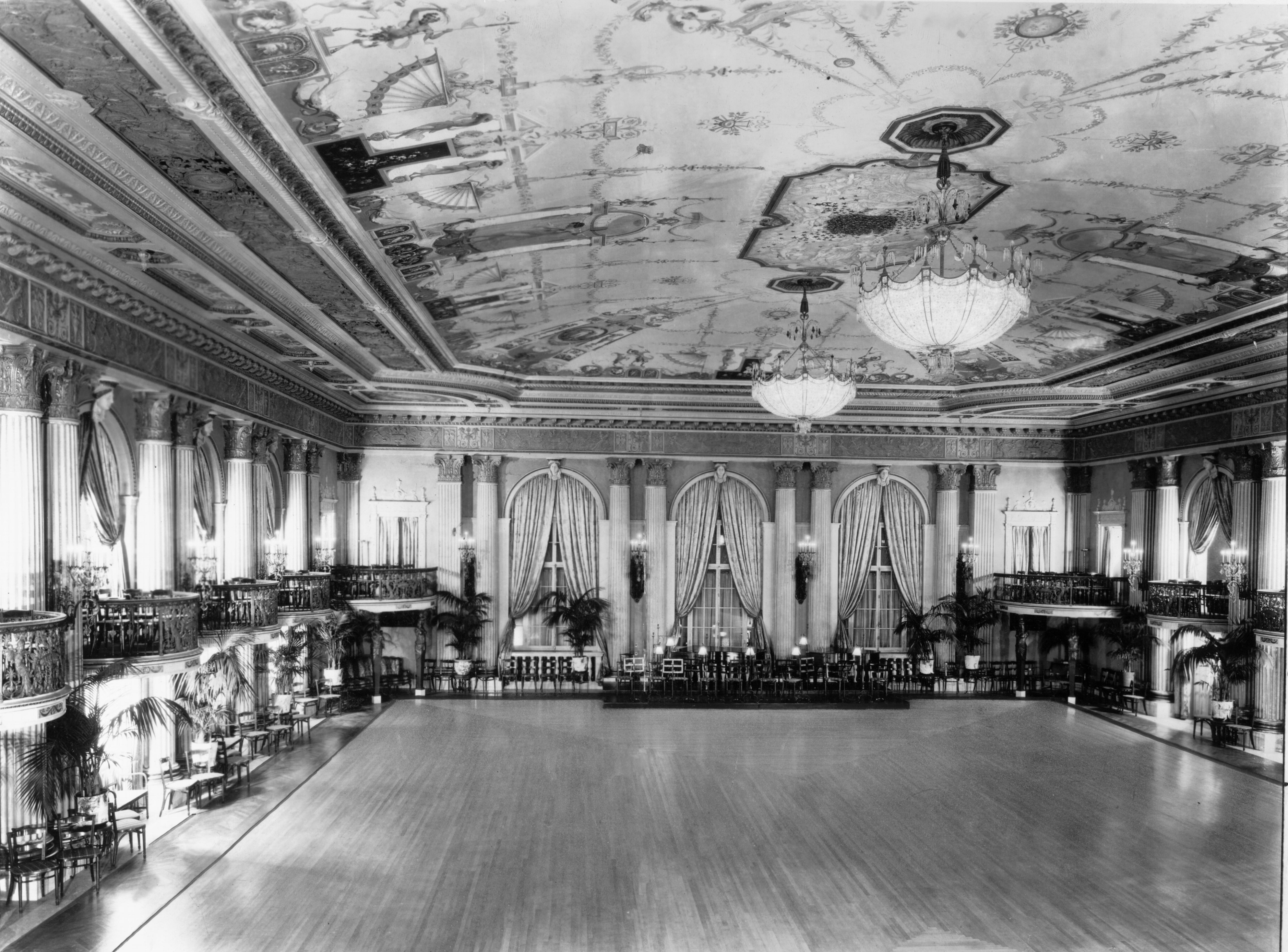 A number of specialty rooms were situated on the first mezzanine floor including, at the northeast corner, the Dining Room, also referred to as the Renaissance room (now known as the Emerald Room) which has a 24-foot high hand-painted ceiling and could comfortably hold 350 guests. Sandwiched between the upper lobby and the dining room were the Palm Room and the Supper room; a contemporary renovation combined these two rooms to create the "Gold Room." Immediately across the Palm Room lay the Music Room, essentially a banquet hall where chamber music recitals could ideally be performed. The Music Room houses an ornate fountain along the western wall and has, overhead, a panel of opalescent glass that gives the illusion of a Louis Comfort Tiffany-style lamp when illuminated. The Times described the space as "just the place for solemn musik [sic]" adding that it was a space that "Lucca Della Robbia might have designed." In fact, the room was later referred to as the Lucca Della Robbia room in some publications. It was reported that four seventeenth-century Flemish tapestries were supposed to hang from walls in the music room but they had been delayed when they were involved in a train wreck; it was reported that one had been completely destroyed by muriatic acid that had spilled during the collision. Following renovations, the Music Room now serves as the lobby of the hotel. At the southeast corner of the First Mezzanine lay the Foyer to the Ballroom (now the Tiffany Room) which served as a primer before experiencing the splendor of the world-famous Ballroom (now known as the Crystal Ballroom).