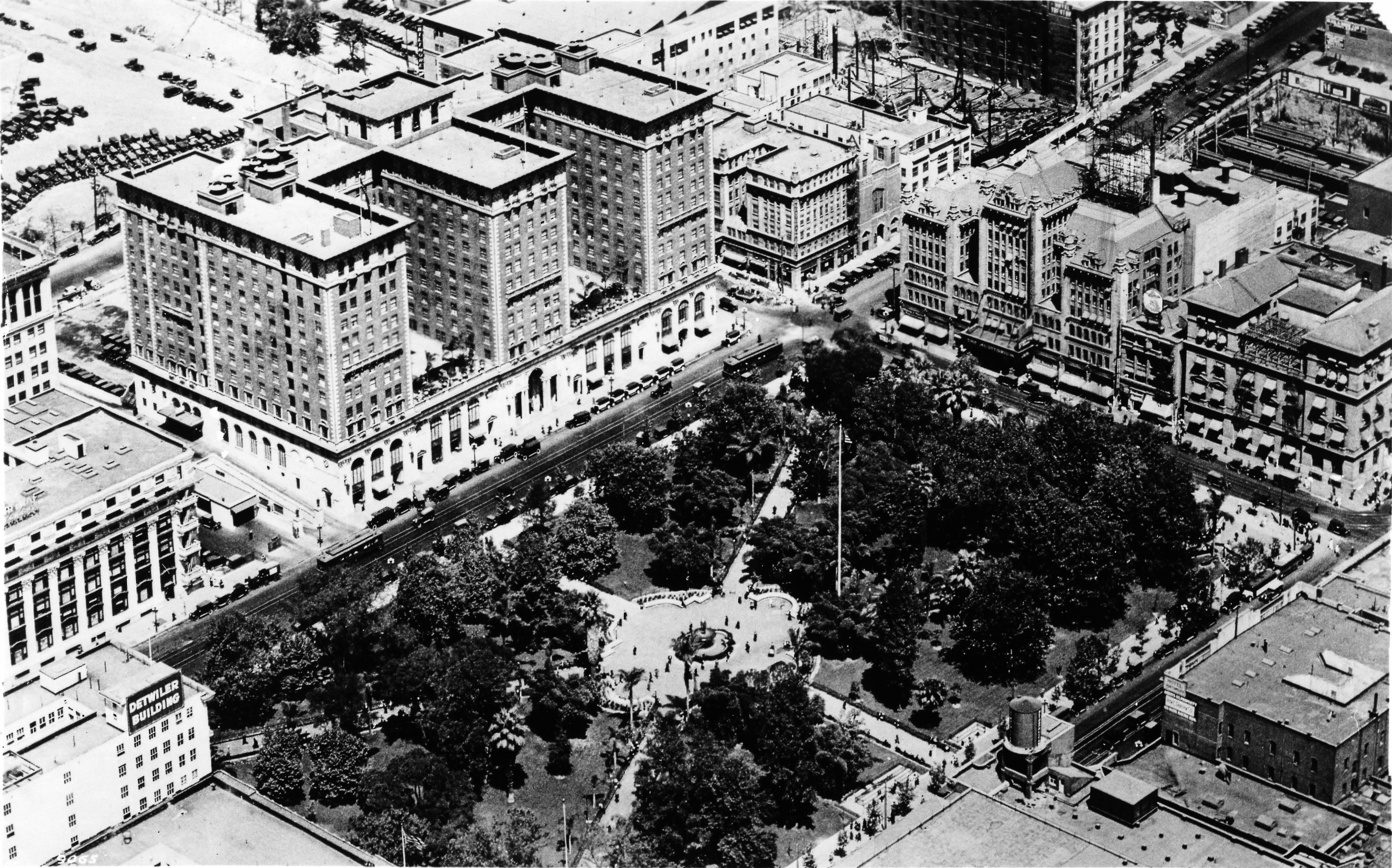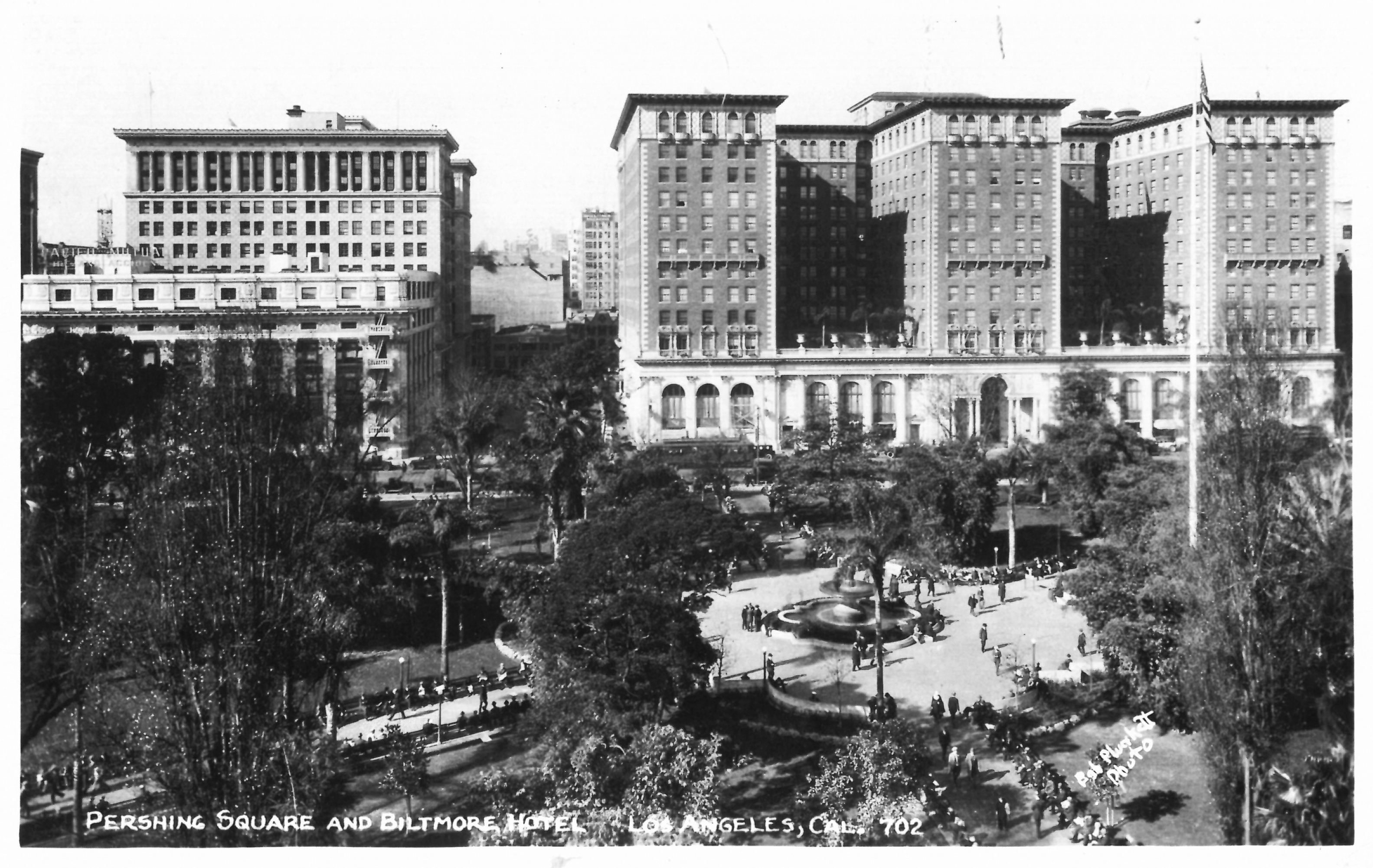 When tracing the history of the Biltmore, it is crucial to consider its location. In nineteenth-century Los Angeles, the rather humble park situated at Fifth Street between Olive and Hill had become the recreational hub for the community that developed outside the Plaza. As Los Angeles bid farewell to the nineteenth century, it wasn't entirely obvious that this parcel of land known as Central Park was destined to become a social epicenter. The park was a rather unremarkable collection of trees, bushes, grass, and pathways surrounding a bandstand that provided a minor reprieve from the day. All of this changed, however, when, in 1910, Los Angeles' premiere architect, John Parkinson, worked his magic, transforming Central Park into the most beautiful public space in Los Angeles. Eight years later, Central Park was re-christened as Pershing Square, and while the beauty of John Parkinson's design has been debased by a number of unfortunate changes throughout the decades, between 1910 and 1951, there was no denying that this was the most beautiful space in Downtown. As a 1937 Times article put it: "It is a beautiful spot…the look of it, especially on a moonlit night, should inspire a poet, the palms and banana trees and the little fountain of imitation antiqued bronze are all etched against a leaden sky. Perhaps two lovers sit there on a bench holding hands, forgetful of all the world but themselves." More than simply being romantic, however, anyone with business to take care of while Downtown would eventually have to pass through it at some point, making it the most conspicuous space in the city, and civic leaders took note.