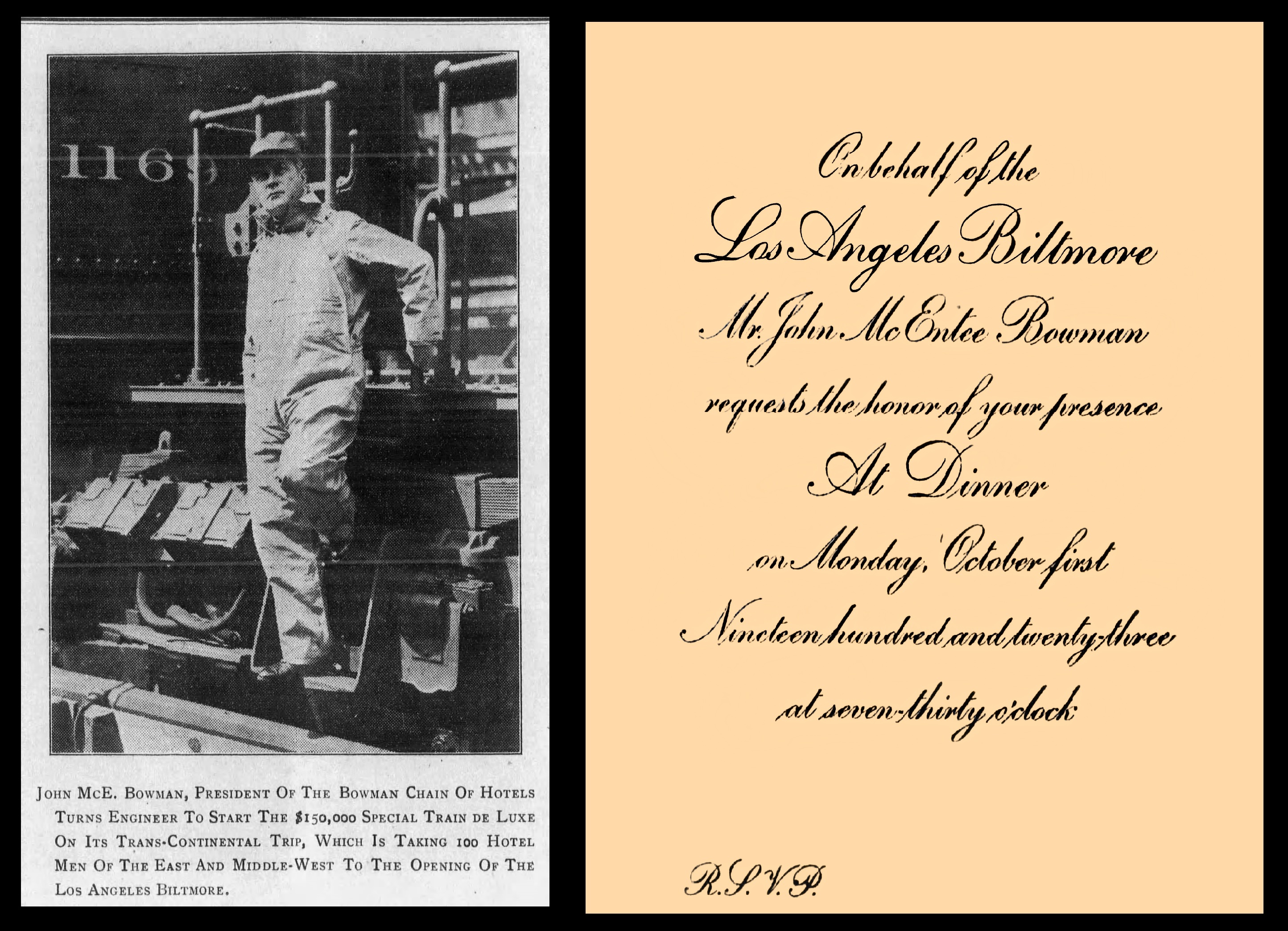 One of the more interesting footnotes in the Los Angeles Biltmore saga is a 10-day train trip organized by John McEntee Bowman. Bowman invited approximately 125 hoteliers and notable figures within the hospitality industry to join him on a cross-country train trip for the opening of the Biltmore. The Dunsmuir News reported that "The Bowman-Woods Biltmore Special De Luxe train, transporting more than 100 hotel leaders, their wives and families on their way to Los Angeles to pay a generous tribute to two great figures in hoteldom [Bowman and V.P. James A. Woods]." The trip was part publicity stunt, part 'humble brag' and part wining-and-dining of hospitality industry bigwigs. The train was under the management of McCann's Tours and left New York on September 19 from New York to Los Angeles in the most roundabout way: making stops in Montreal, Vancouver, Seattle and San Francisco before reaching Los Angeles on the 29th. The party made brief stops along the way and local proprietors often bestowed gifts upon the passengers. In Seattle, it was reported that the proprietor of the Yakima Hotel, Bertha Johnson, bestowed the party with 17 boxes of apples, 17 boxes of grapes and 12 boxes of pears to prove that "Yakima [Washington] fruit is the finest in the world." Another stop in Dunsmuir [C.A.] reported that a number of local hotel proprietors boarded the train to present "their welcome in the name of hotel fraternity." Those on the train were present for the entirety of the festivities in Los Angeles including a special dinner on October 4 given in honor of James A Woods, Vice President of Bowman hotels. The group stayed at the Biltmore until October 5 when the return trip left L.A. passed through Denver, Kansas City and Chicago before returning to New York.