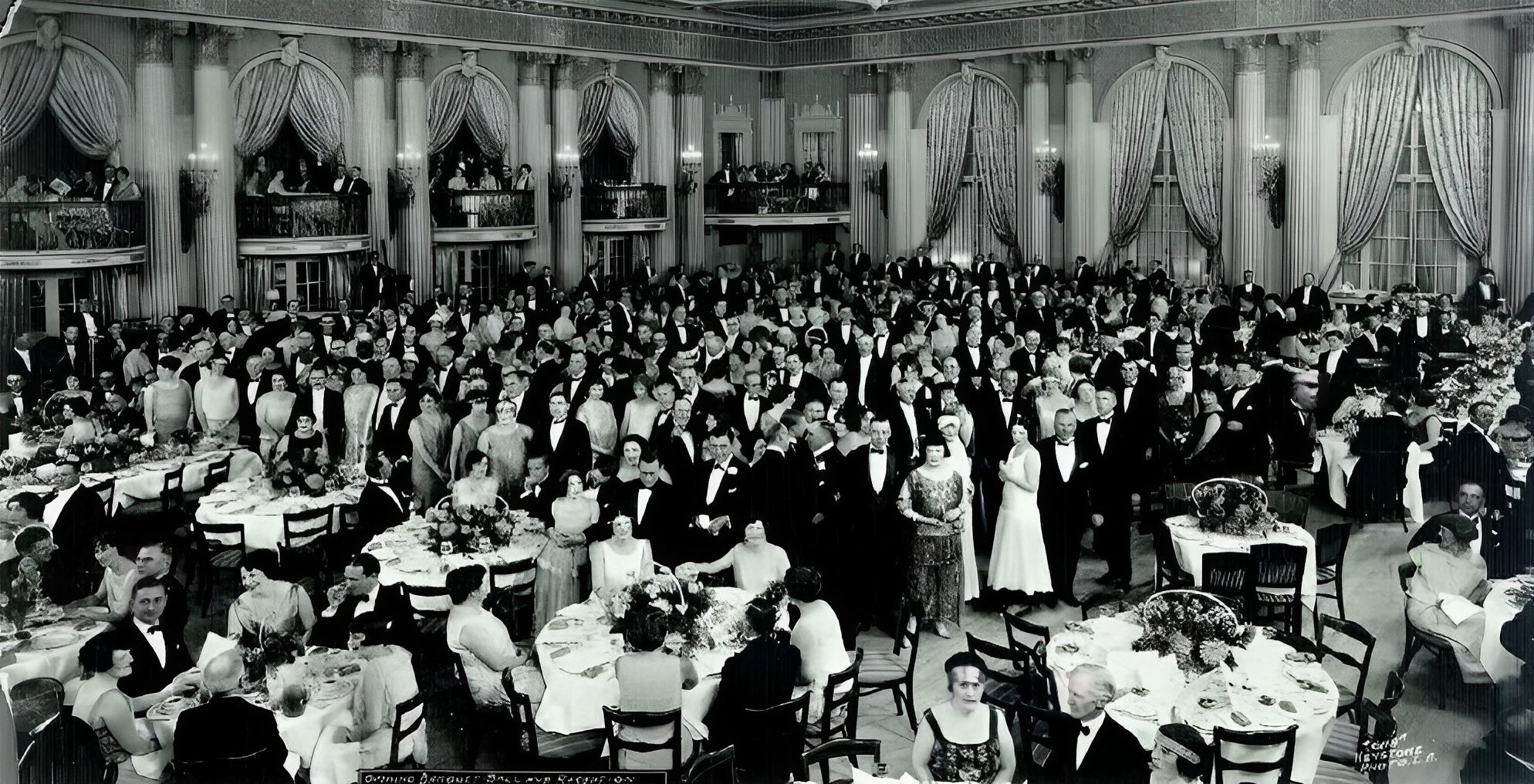 Festivities began at 7:30 p.m. and were broadcast on local radio station KHJ. The Daily News reported that Theodore Kosloff's dance troupe situated themselves on the platform above the revolving door (now gone) and gracefully posed for guests entering the Hotel through the Olive Street entrance. Reporter Eileen Hennessy of the Evening Express reported that explosions of fresh flowers covered every surface in the Galeria Real; some of these bouquets were part of the Biltmore's decor while many were 'welcome' gifts from local business owners, contractors and "friends in all parts of the country." Every public space in the hotel was utilized for formal dining space, and an orchestra was stationed in each room. The main musical attraction, Art Hickman and his band, were stationed in the Supper Room. Hickman had been hired as the musical director of the Biltmore and his band could be heard on KHJ during their regular performances. By all accounts, the dance floor of the ballroom was packed.