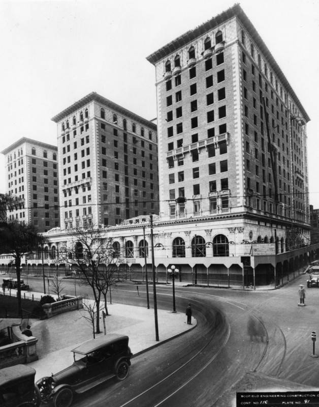 On March 23, Scofield Engineering Construction signed their contracts, and 5 days later, excavation of the site was underway. The Examiner reported that on April 1, 1922, Llewellyn Iron Works of Los Angeles, the same company responsible for the ironwork in the Bradbury Building, had been awarded the contract to provide a reported 5,200 tons of steel that served as the frame of the hotel. One month later, the Times reported that Schultze had arrived in Los Angeles to make "preliminary studies for the class "A" hotel building to be erected at Fifth and Olive Streets by local capitalists and businessmen." By December, work on the steel frame was complete, and at the end of January, Bowman had returned with Schultze to Los Angeles to inspect the site. Bowman spoke to the Times, relaying that construction was moving at a record pace: "...from what I have learned. No hotel of like size was ever erected in such record time as the new Biltmore here in Los Angeles. I intend to make a thorough inspection of the structure and probably announce tomorrow how soon we can open up. At present, I believe the opening day will be October 1…" The Times described the building as 65% complete and explained that bedroom furniture had been ordered from Grand Rapids, but it was expected that lobby furniture would be made here in Los Angeles. Construction continued into the spring and summer months, and an occasional reminder was shoehorned into the local newspapers to make sure no one forgot that the most magnificent building in Los Angeles was coming. An April 16 story in the Times quoted Bowman who insisted there would be a chapel "for the use of its guests for prayer and meditation" while the June 7 edition of the Los Angeles Record reminded readers that the Biltmore was slated to be finished in October and suggested that "if you are thinking of dinner there on the opening night, now is the time to begin finding a place to park your car." From start to finish, the project reportedly took eighteen months to complete.