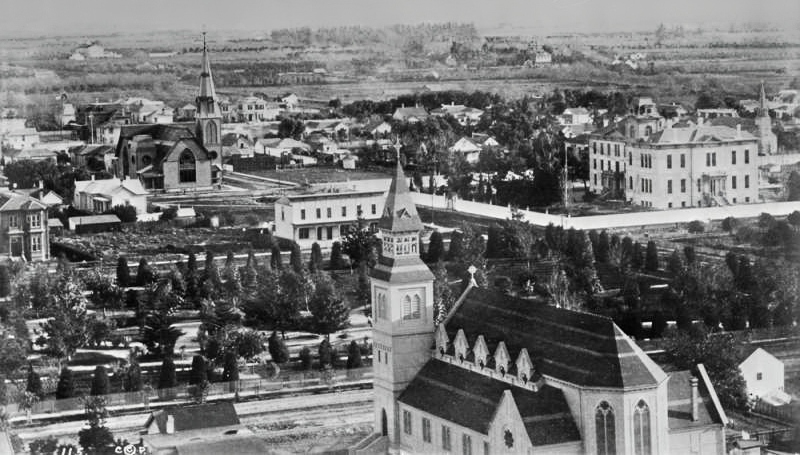 "The hotel (I forget its name) was small and narrow, perhaps two or three stories in height, dingy for lack of paint…I remained there for some weeks in a room overlooking the garden of St. Paul's Cathedral, where the choir boys marched, singing on Sunday mornings. Central Park, somewhat unkempt but pleasantly umbrageous, was directly opposite the little hotel, and a wizened Chinaman had his laundry in a tumbledown shack where the huge building of Pacific Life Insurance Company now rests on the soil so heavily that it groans with immense burden."