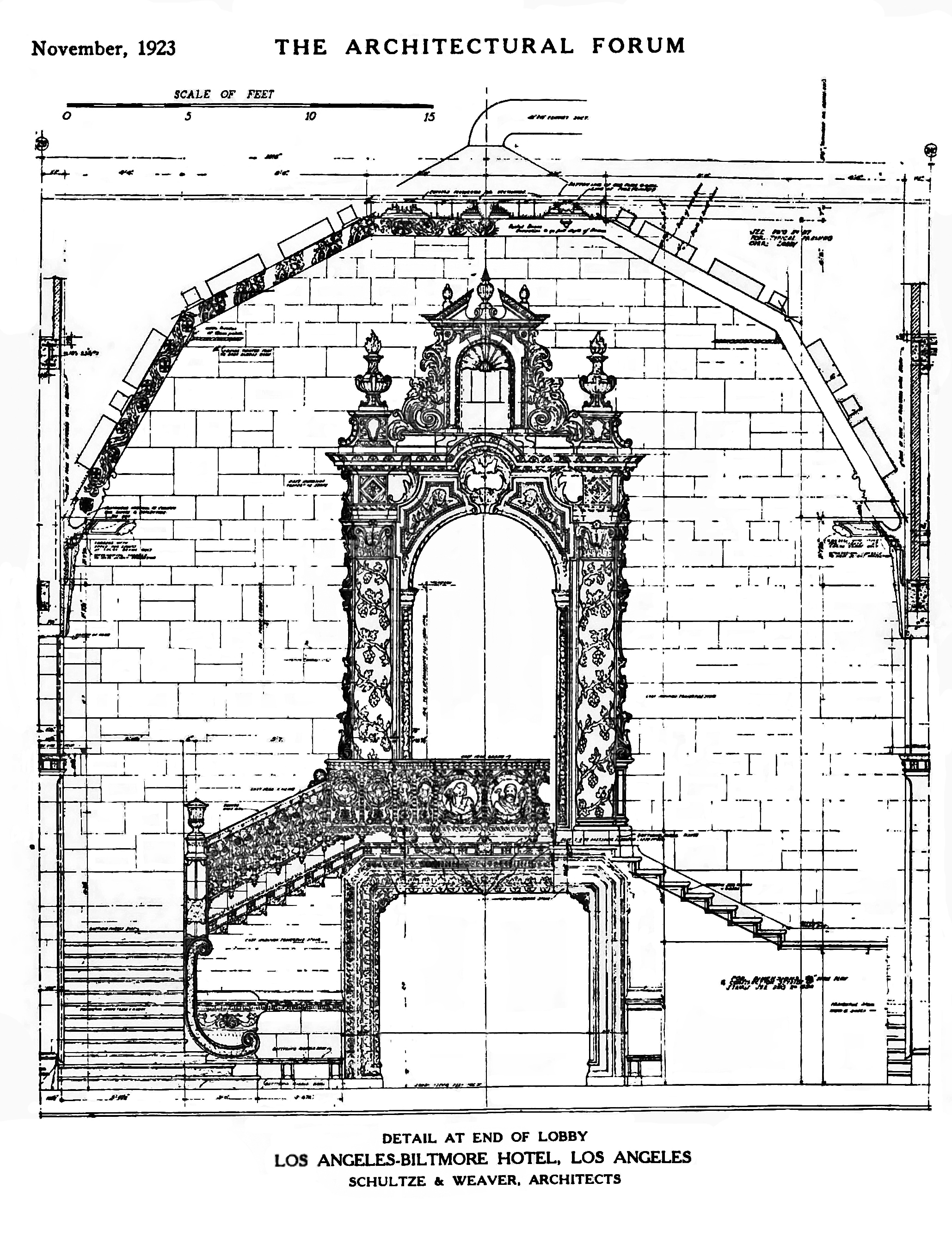 Leonard Schultze penned an article for the November 1923 issue of The Architectural Forum entitled, "The Architecture of the Modern Hotel," and, while it does not specifically mention the Biltmore, it was Schultze & Weaver's only completed project at that point in time. The article provides insight into the level of planning Schultze felt was necessary. What he conveys is that no detail was too small to be considered, "The dimensions and proportions of the lot upon which the hotel is to be erected will govern, in part, the arrangement of the rooms so that the most economical use of it may be obtained. This will affect the character of the outline of the building and determine the general mass of the structure…" More importantly, Schultze was practical when it came to matters of finance, writing that "the architect must always bear in mind the ultimate cost of the structure." He explained that "If the appointments and decorations are too expensive and the volume of cubic contents too great, it is sure to prove a financial burden to its operators and ultimately be classed among the failures. There are numerous hotels in this country which have cost so much money that they cannot be made to bring in an adequate (if any) financial return to those who invested in the ventures." Cost was factored into planning, and one of the reasons the hotel was completed in such a short time and at a reasonable cost was that many of the ornate details were made from plaster rather than, for example, carved wood, marble, or stone. Plaster is not unusual in construction (particularly today), but given the profile of the project and the expectations placed on it, it is a curious choice, particularly when considering the ephemeral nature of plaster. That being said, it's oddly appropriate in a town known for film sets constructed with plaster, plywood, and imagination.