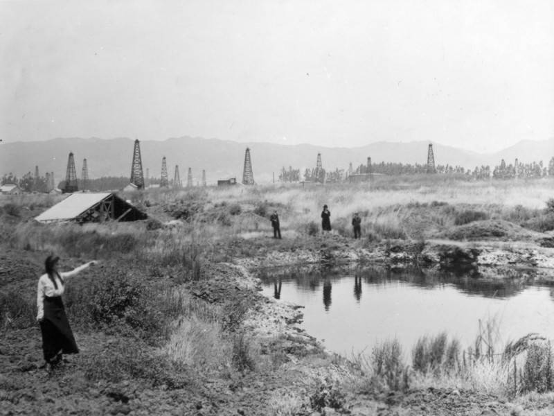 Four people gather around a tar pit near the Hancock oil field, circa 1910. (Security Pacific National Bank Collection)