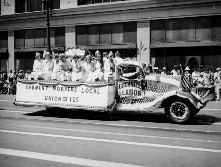 Parade float entered by Garment Workers Local Union 125 rides past the Broadway department store at 401 South Broadway, circa 1937