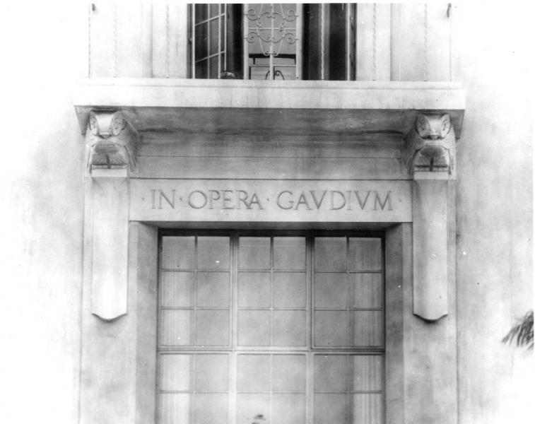 Designed by sculptor Lee Lawrie, a long-time collaborator with the library’s architect, Bertram Goodhue, two sets of Lawrie’s limestone owls are found directly under the iron balconies on the east and west corners of the Fifth Street side of the Goodhue building. They are part of the mezzanine level (not accessible to the public.) One balcony bears the inscription In Libris Libertas (In books is [found] liberty) and the other, In Opera Gaudium (In work is joy.)