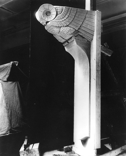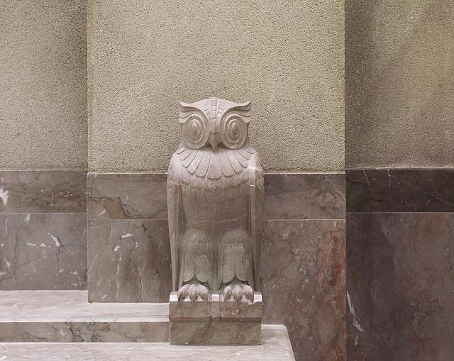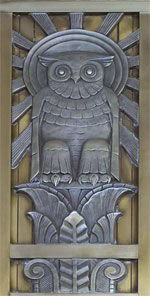 Of special interest is Lawrie's repeated use of the owl motif. One of the most beautiful is the metalwork owl in the John Adams Building of the Library of Congress in Washington D.C., which adorns the door to the fifth floor’s center reading room. Called “the owl of wisdom,” it is a prime example of the 1930s Art Deco style. In addition, a sculpted stone owl of Lawrie’s is also inside the building. The John Adams Building is renowned for its exquisite doors, which are another artwork of this famed sculptor.