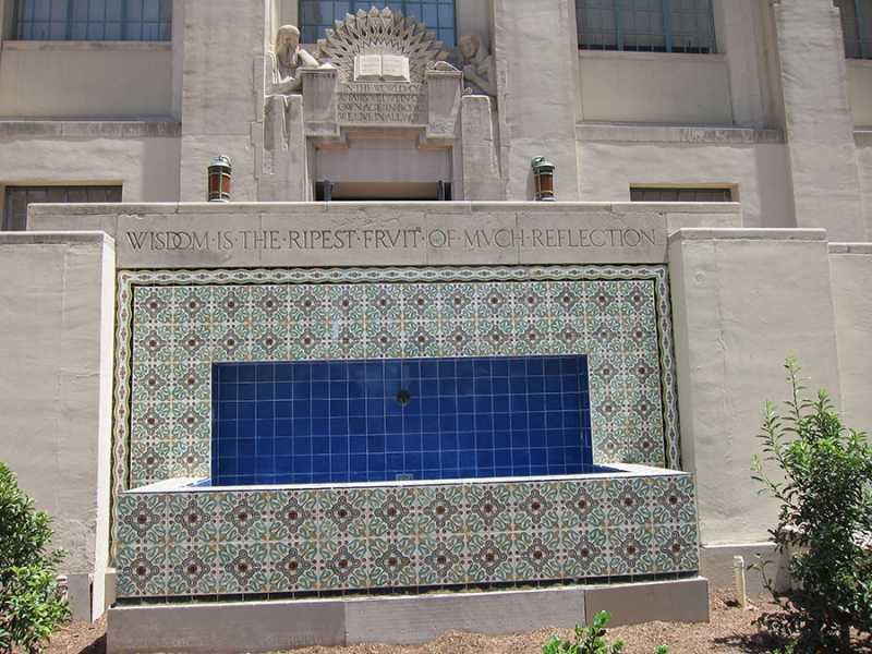 The theme of Los Angeles’s Central Library, The Light of Learning, is illuminated inside and out by torches, sconces, chandeliers, and other references to light and learning and wisdom, like owls and serpents. One letter, in the correspondence between architect Bertram Goodhue and iconographer Hartley Burr Alexander, defines this theme as “Light and learning are associated together by an impulse so natural that it pervades the great literature of the world. Knowledge is imagined as a lamp, wisdom as a guiding star, and the conscious tradition of mankind as a torch passed from generation to generation.”