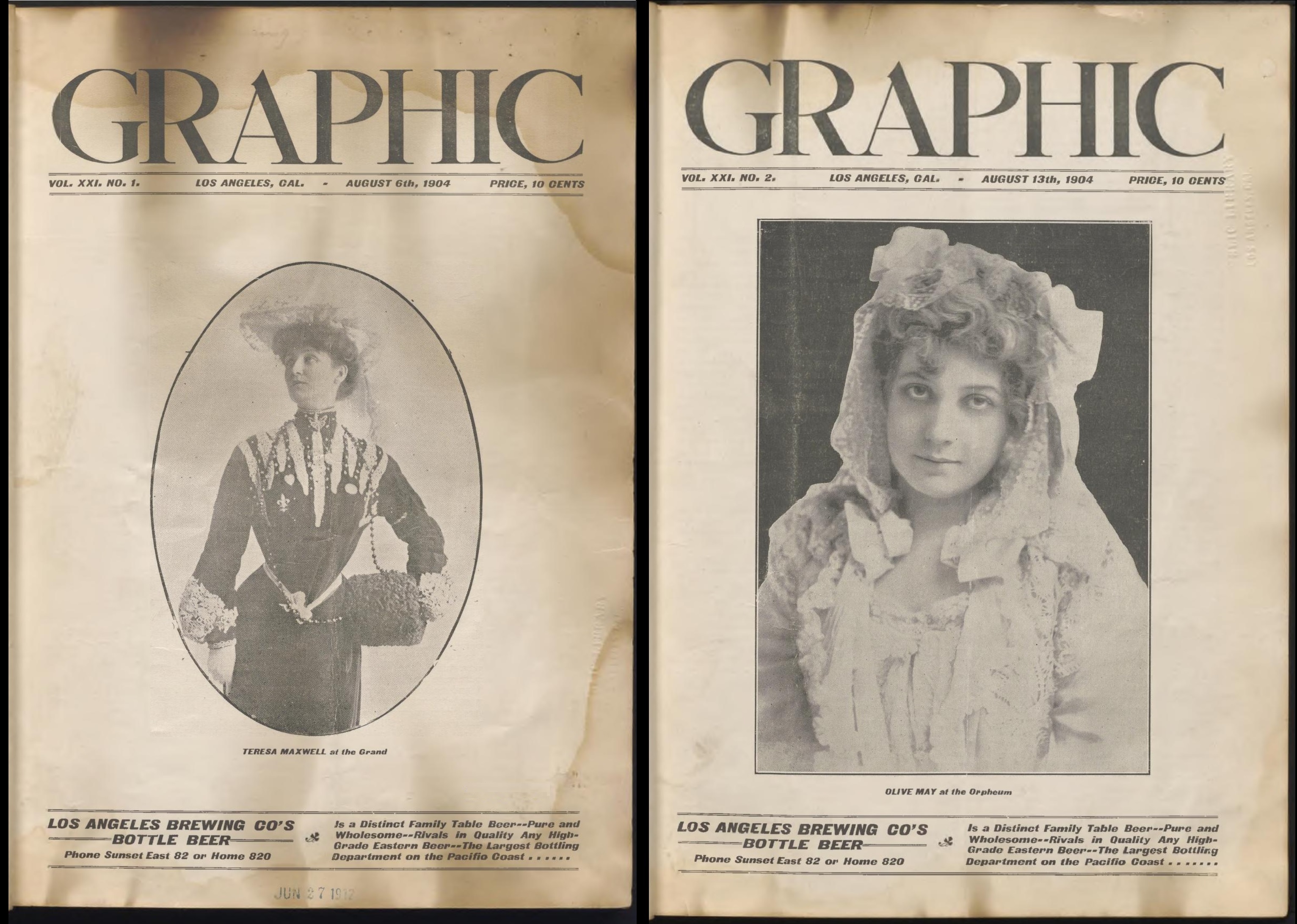 By mid-2021, the wait was finally over, and the remaining issues were digitized and uploaded to both California Revealed and The Internet Archive. Upon initial inspection, the first thing you may notice is the physical condition of the magazine. Colors, if any, have dulled over the past century, and early issues bear the scars of the 1986 Central Library fire, making it all the more remarkable that our collection has survived. Los Angeles history enthusiasts will find information on fashion, theater, books, music, society, finance, and politics in Southern California with an emphasis on Los Angeles. Familiar topics include the Mission Play, a special issue devoted to the White Fleet’s visit to California, Shriners conventions in Los Angeles, and tons of garden-variety Southern California boosterism, just to name a few subjects. The Graphic helps to dispel the idea that Los Angeles thoroughly lacked the culture and sophistication that towns like New York or Chicago had in excess. The Graphic will reveal itself as a rich resource for anyone who is curious about Los Angeles at the turn of the century, and now it's available to the world to view without appointments, restrictions, or even a library card!