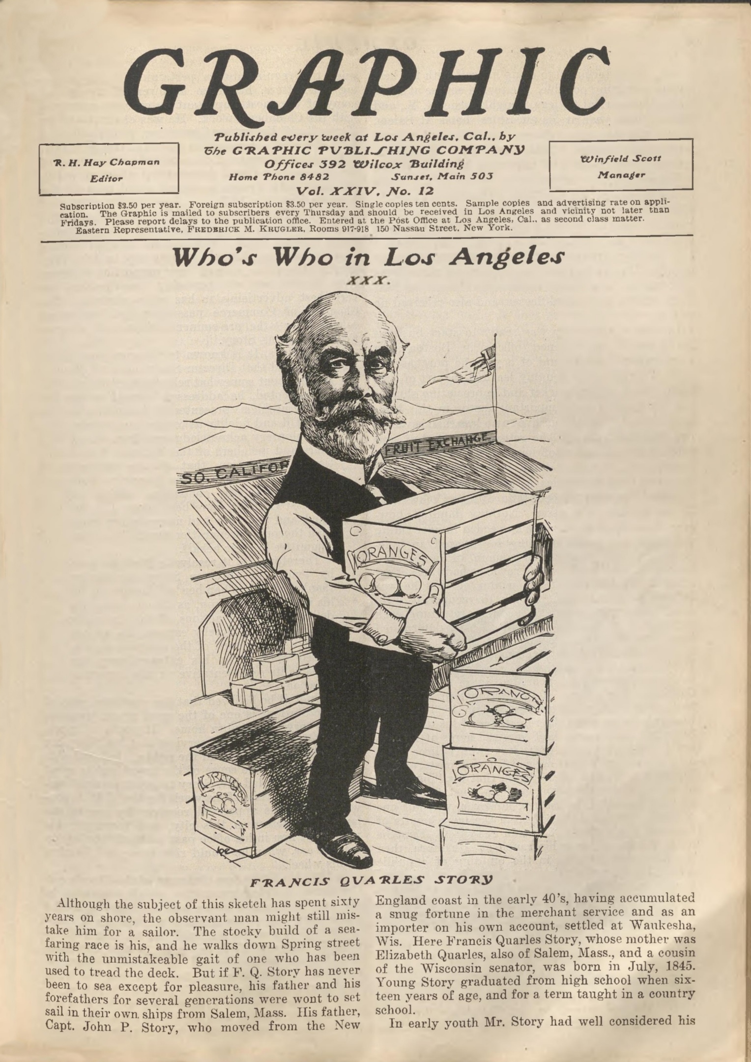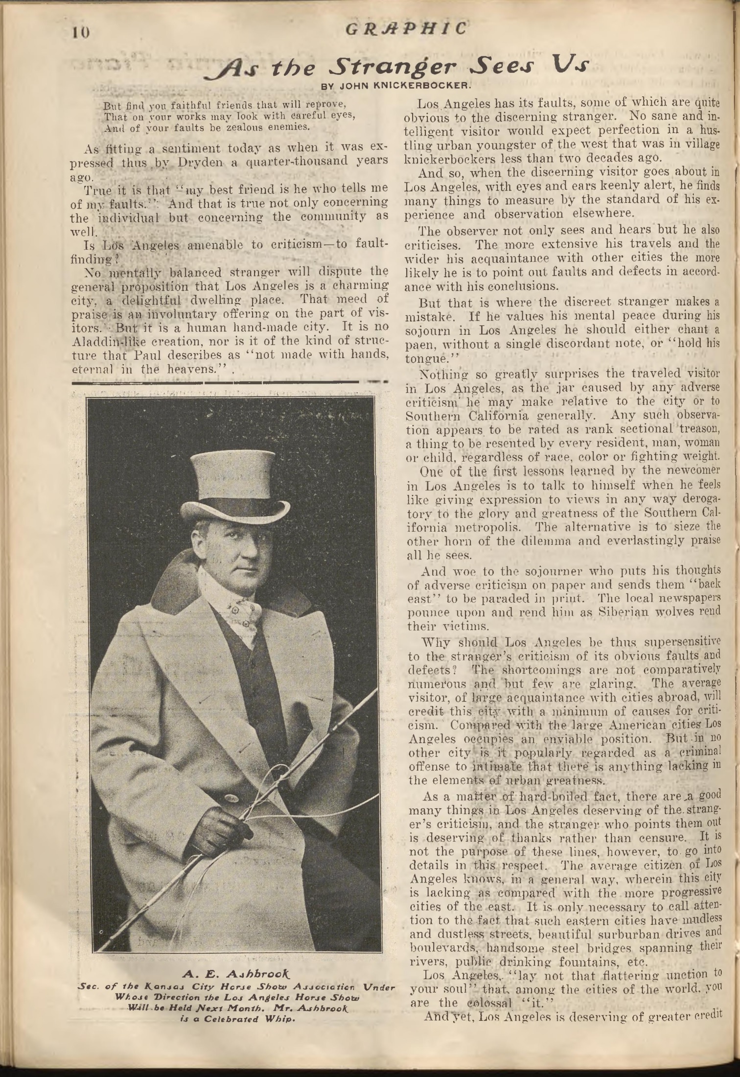 For nearly a year, I studied this solitary issue dated March 24, 1906, with great curiosity. It provided a tantalizing glimpse of life in Progressive Era Los Angeles and included profiles on Francis Quarles Story, the sometime President of the Los Angeles Chamber of Commerce and the California Fruit Growers Exchange, as well as suffragist Elizabeth Kenney, one of the first female attorneys in Los Angeles; though what really caught my attention was an essay written by "John Knickerbocker" (probably a pseudonym) entitled 'As the Stranger Sees Us' because it was a defense of our city: