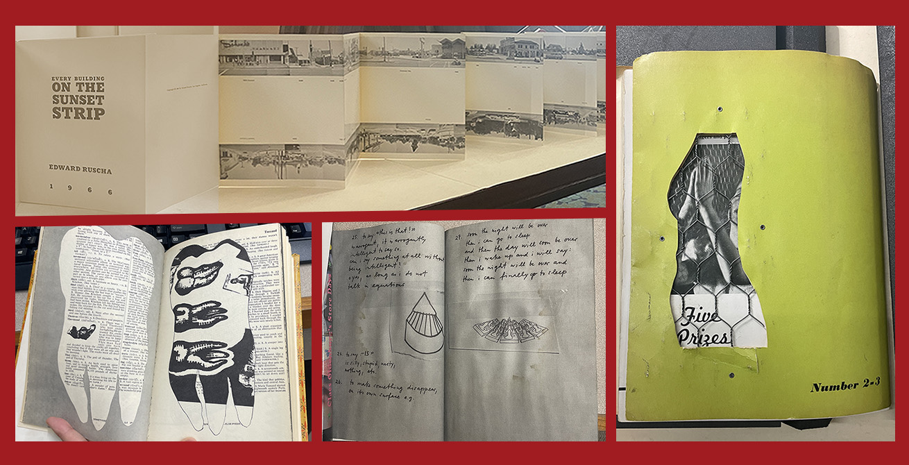Most likely, the best-known artist’s books are those made by American artist Ed Ruscha. Ruscha chose to make his books look as inconspicuous as possible in his celebration of the vernacular landscapes of Los Angeles and its surrounding environs. The titles of his small books that were written between 1962 and 1978 are as literal and banal as possible. Of the 16 Ed Ruscha books made between 1962 and 1978, nine are held in Special Collections and are listed below.
