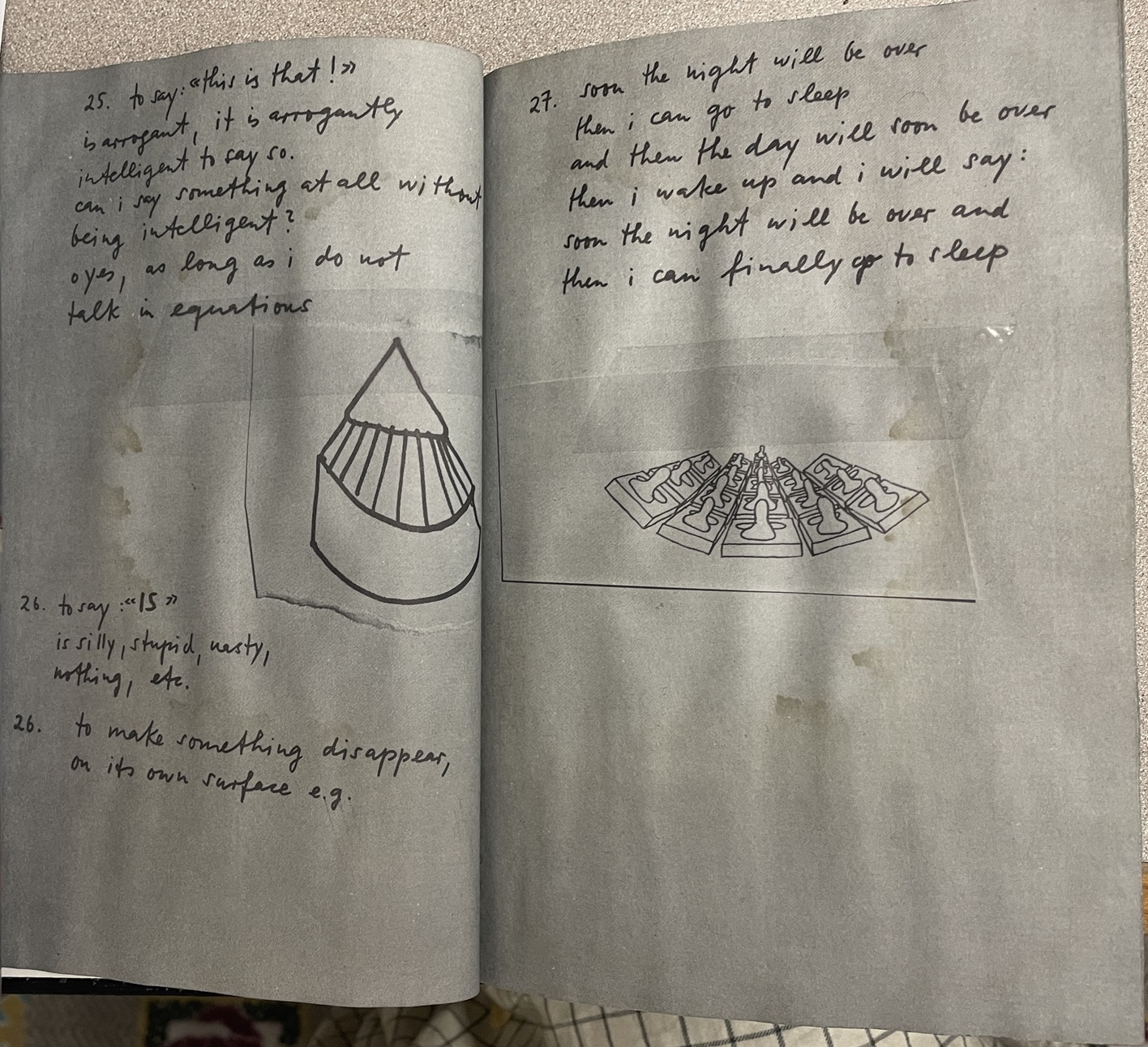 Dieter Roth (1930 – 1998) was a Swiss-born artist active in Fluxus. In 1968, he created 246 Little Clouds, which delightfully uses raking light in photo reproduction to make it seem like actual pieces of paper are taped on each page. The book is a stream-of-consciousness narrative about his trip from New York to Iceland.