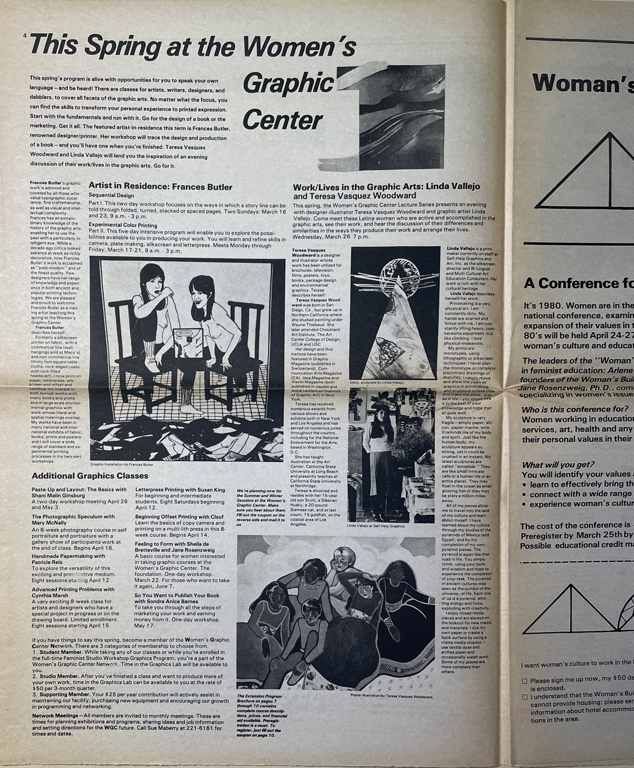 The Woman's Building hosted many programs within its doors, including the Feminist Studio Workshop (the inaugural group), Center for Art and Historical Studies, Los Angeles Women's Video Center, Women's Writer Program, and most importantly, for this blog series, Women's Graphic Center. The Women's Graphic Center (WGC) was both an educational and community studio space where artists could take classes and rent studio time to create books, posters, and other printed ephemera.