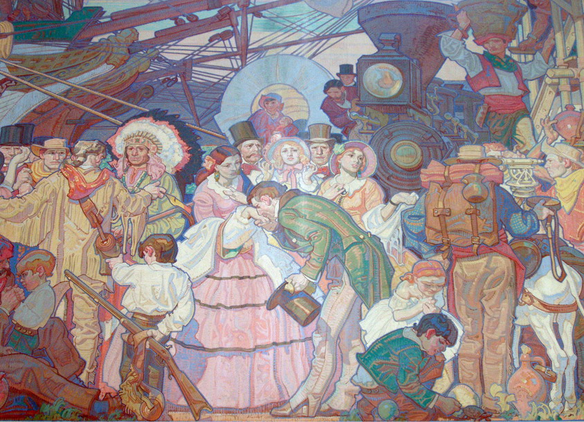 The mural’s theme of California History was suggested by Goodhue Associates. Cornwell chose to design panels covering four areas of California history: the Era of Discovery, the Missions, Americanization (which he called ‘the arrival of the white woman’), and the Founding of the city of Los Angeles. The eight smaller panels framing the corners depict: Fire, Water, Earth, and Air; Music, Art, Native Industry, and Learning.