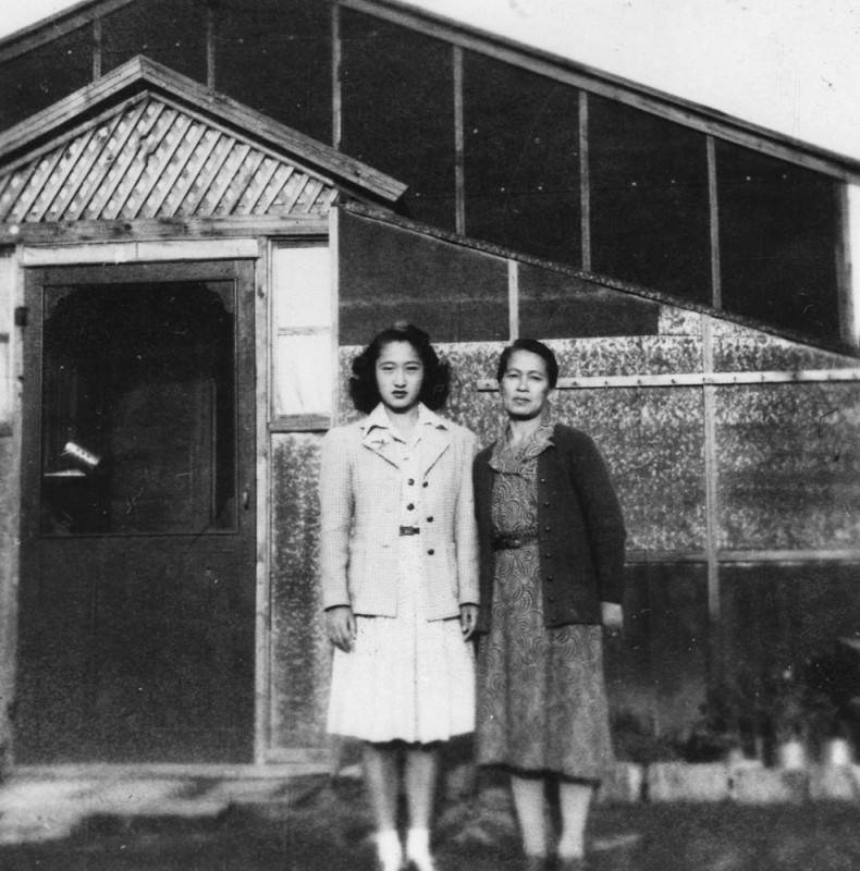 Yuki (left) and Aki Toya in front of their barracks at the Tule Lake internment camp, [1945]. Shades of L.A.: Japanese American Community