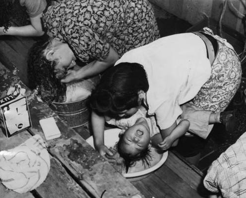A little Japanese child meekly submits to a hair wash while a woman nearby also washes her hair at the Santa Anita Assembly Center, [1942]. Herald Examiner Collection