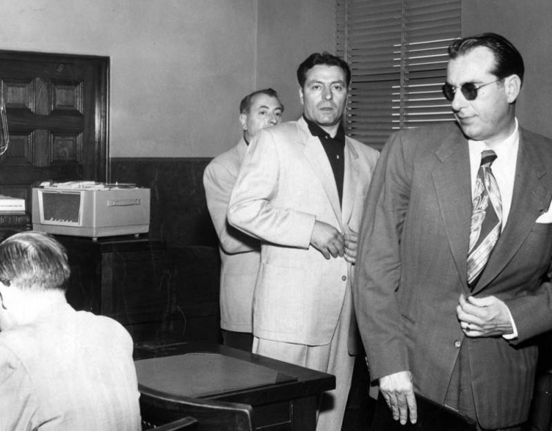 Mickey Cohen's Bodyguard and enforcer Johnny Stompanato opted for a suit and tie, rather than his usual open-necked style, at Cohen's trial. Herald Examiner Collection