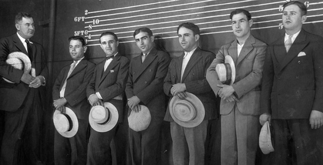 "Clothes make the man", wrote Mark Twain. Whether they be politicians, corporate executives, movie stars or even gangsters, one sure-fire way to impress is simply to dress. Custom made suits, shirts, shoes, even cars (fitted with bullet-proof windows) declare "I've arrived". In the underworld of organized crime, those who arrive and make it to the top often have a very short stay, and the departed are bid farewell with a funeral fit for a king, or "capo". With money flooding in from bootlegging, gambling, racketeering and other forms of vice, mobsters spent lavishly on their lifestyles, which included the silk, serge and cashmere weaves that made a small frame tall, and a tall frame tower. The following pictures, taken by Herald Express photographers, seem to delight in the glamour of the gangster, and the paper even went so far as to include detailed descriptions of their ensembles as they arrived at the Hall of Justice or were released from jail, as they would with celebrities at a Hollywood premiere. These images and more can be found on the LAPL Photo Collection database at http://tessa.lapl.org