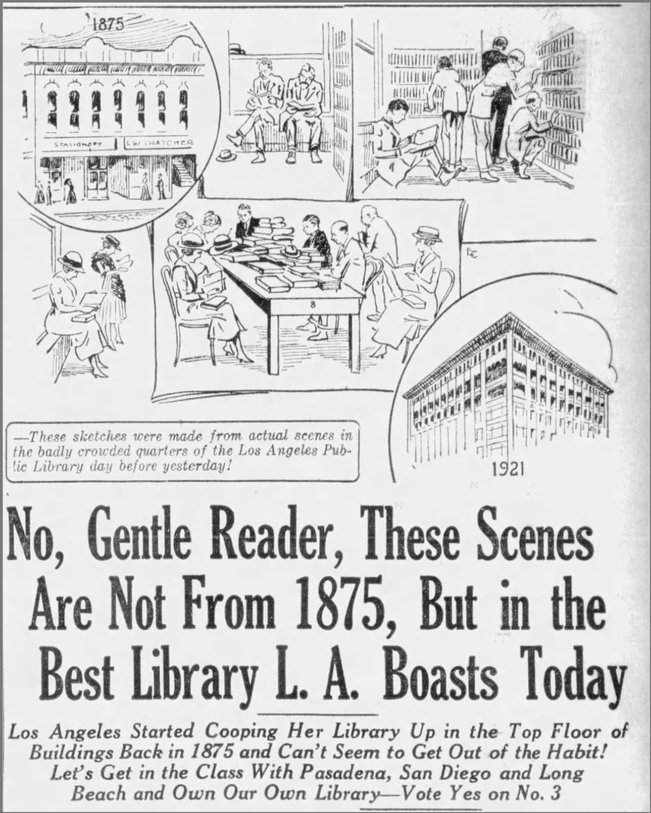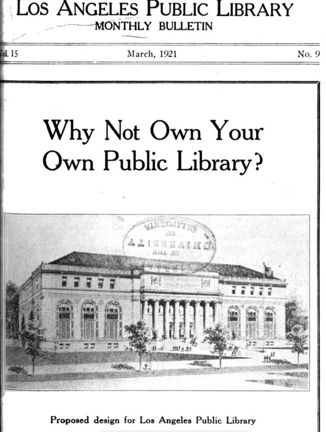 “Immediately the Library organized a campaign force, embracing every worker in the library system, from Directors to pages, and entered a period of four weekends devoted to intensive continuous publicity designed to bring home to every resident of Los Angeles the reasons of practical economy and civic interest that made a central library building an imperative necessity.”—Report of the Librarian, Thirty-Third Annual Report of the Board of Directors of the Los Angeles Public Library, 1920-21