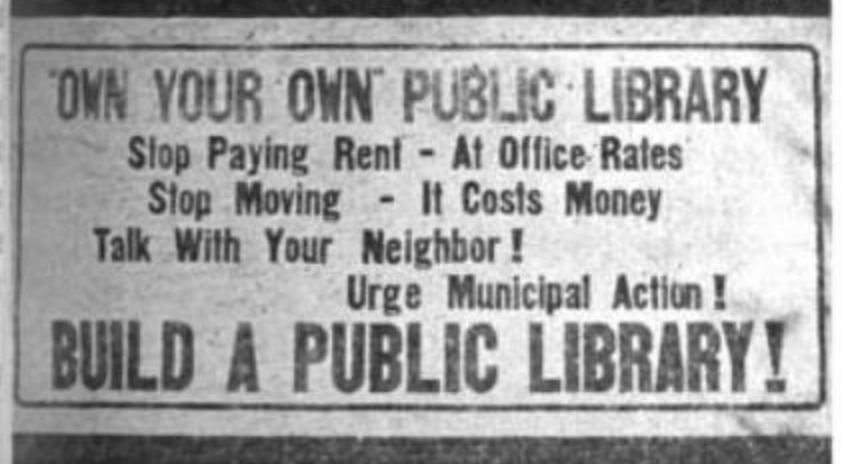 An outline for the library campaign was drawn up and committees were formed to focus on each activity, with Ms. Shannon to keep it all straight. The 1921 annual reports briefly described the work that went into the campaign, including meetings, charts, word choice, distribution, and clear communication. There were staff-written articles and ads in large and small newspapers around the city; banners and signs were hung throughout the library and in the branches; exhibits were created in the library, banks, and stores; talks were given in women’s clubs, civic, social, fraternal and religious organizations, businesses and union meetings; and the candidates for local office were enlisted to support the library measure.