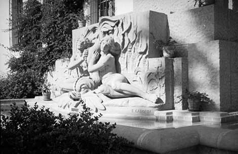 The contemporary version appears much the same, but in fact is a re-creation put in place in 2011, as the original sandstone had deteriorated. In addition, despite the watery appearance of the green tiles, there is no water in the fountain, a casualty of California’s persistent drought.