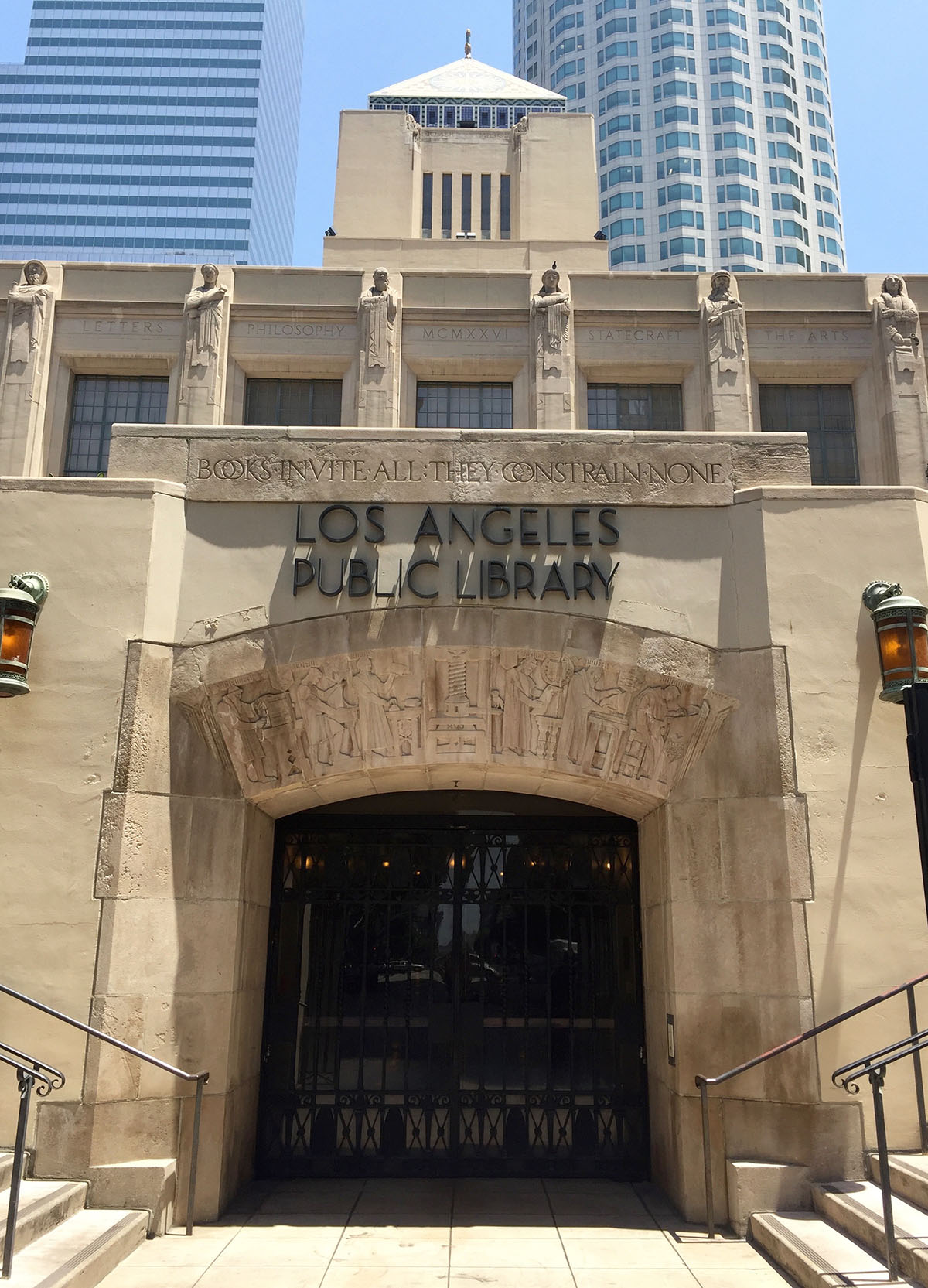 Did you know that when Central Library opened in 1926, the entrance at 530 South Hope Street was both the "front door" and mailing address? Patrons entered the gates at Hope Street and walked up a long sloping ramp to a circulation desk at the center of the lower level. In fact, if you peer through the glass doors at street level today, you can still see the original entrance ramp.