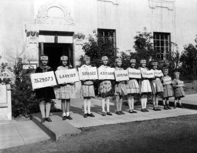 Children representing the years 1918-1927 display the library's circulation figure for each year