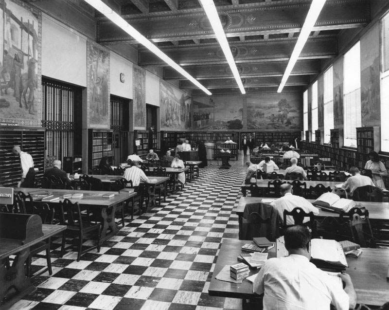 Throughout the Great Depression, Central Library continued to provide checkout services in each department and maintained staff at each of the six entrances to the building. But World War II brought severe cutbacks. The 1942 Annual Report states: "The greatest dislocation has been the acceleration of staff turn-over to a veritable whirligig. The library's salary scale is so far below that of industry or even of the other city departments that clerk typists, janitors, and maintenance men have been transferred at a rate exceeding one a day to other better paid place of employment. As for the messenger clerks who do our book shelving, most of them work just long enough to absorb a week of expensive instruction and supervision and then 'softly and silently vanish away and never are heard of again.'"