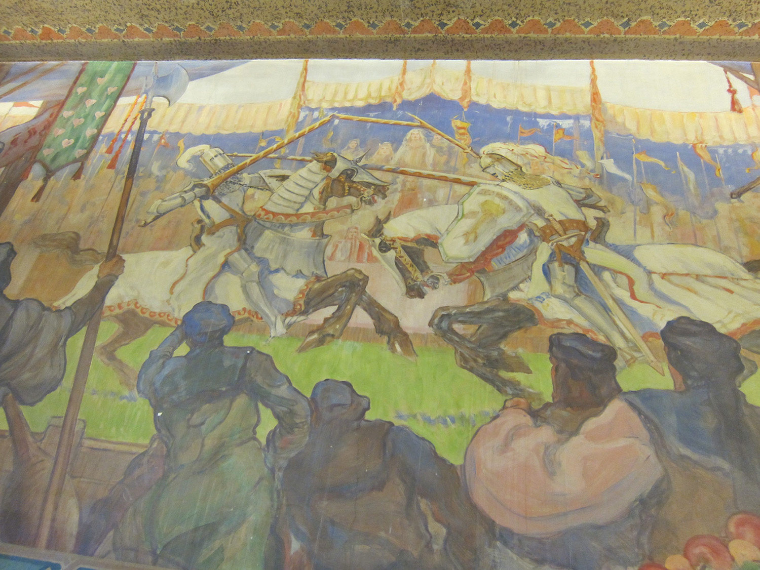 Ivanhoe, saving Lady Rowena. Note the shield icons in the framing edges of the painting. It is replicated in the new Children’s Room’s carpet, below.
