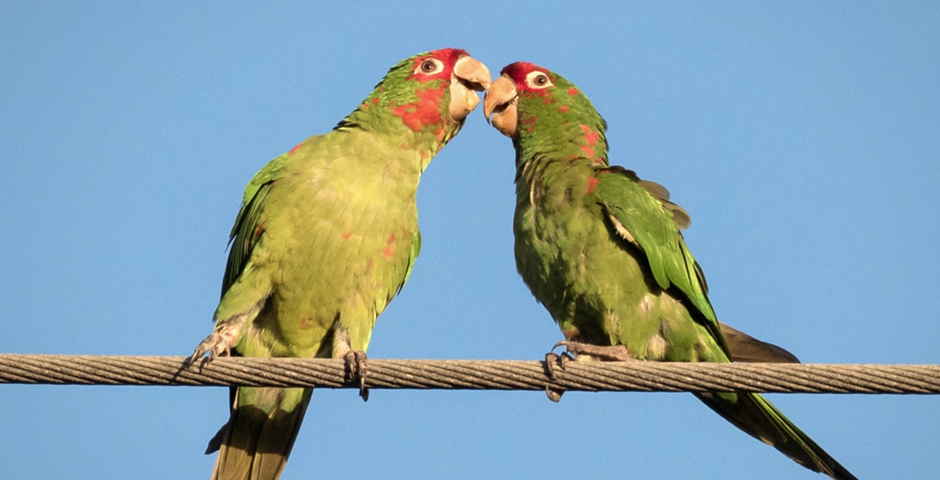 We know there are around eleven species of parrots that now call L.A. their home. The predominant breeds are the Red-Crowned Parrot from Mexico (endangered), the Yellow-Headed Parrot from Southern Mexico down to Honduras (endangered), and the Red-Lored Parrot from the Caribbean Coast in Southern Mexico down to Nicaragua. It's interesting to note they are all considered native now, because they have been here in So Cal for such a long time. Sort of like the humans that flock here for the good weather and plentiful roosting opportunities.
