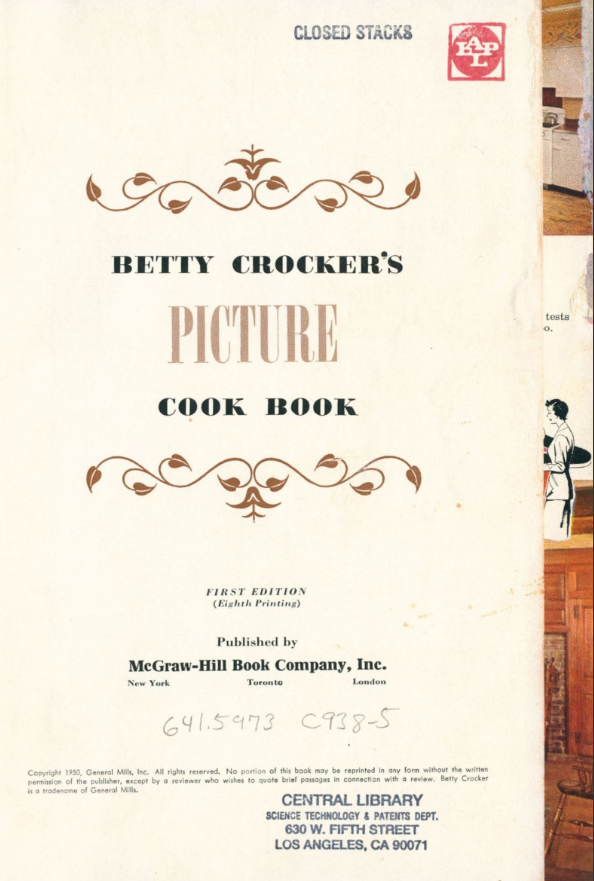 Below is the recipe in a Central Library copy of the chiffon cake recipe in the first hardcover Betty Crocker cookbook of 1950.