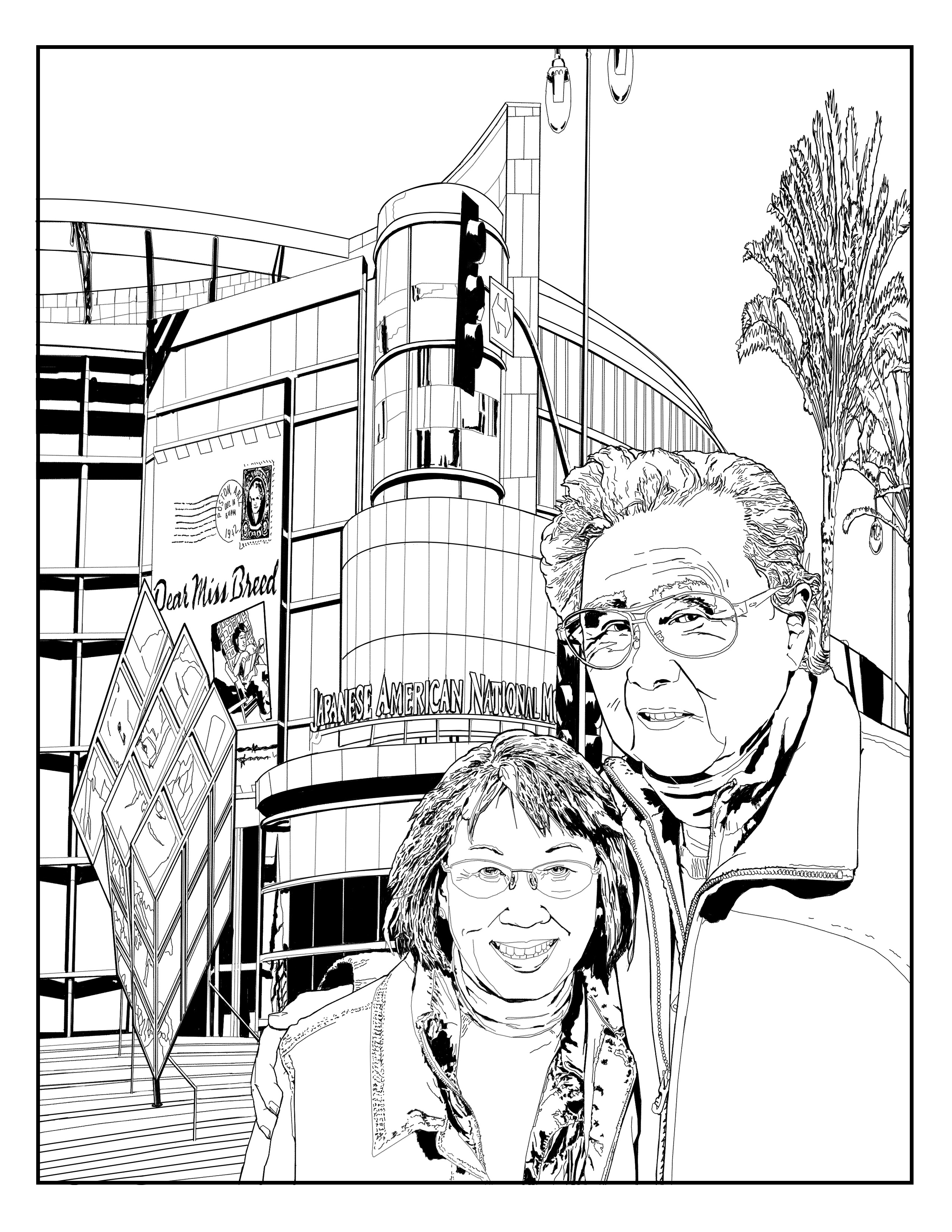 The couple are pictured in front of the Japanese American National Museum (JANM) in Little Tokyo. The Japanese American National Museum was founded in 1985 to enhance the appreciation and document the history of people of Japanese descent in the United States. Pictured behind the couple is a poster version of the book Dear Miss Breed. Clara Breed was the City Librarian for San Diego Public Library for 25 years and worked for the library system for 40 years. Before the Japanese Americans families left San Diego for the camps, Breed encouraged the children to contact her, and she would send books, clothing, pencils, and other supplies to these children. Breed received over 250 letters from her librarian patrons and protested against Executive Order 9066 on behalf of Japanese Americans with letters to Congress, and articles published in Library Journal and Horn Book Magazine.