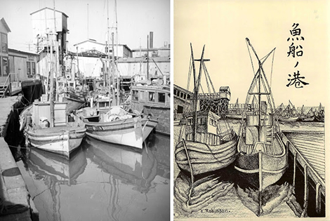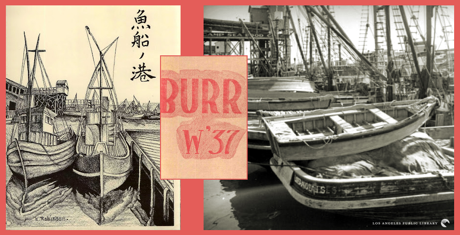 ![(L) Boats docked by repair shop on Terminal Island, [ca. 1938]. Herman J. Schultheis Collection. Los Angeles Public Library. (R) Drawing of fishing boats by Burroughs student, Keith Robinson. Robinson’s drawings in particular show remarkable skill and talent. [p.89]](/sites/default/files/media/images/blog-lapl/2019/termIlsland16.jpg)