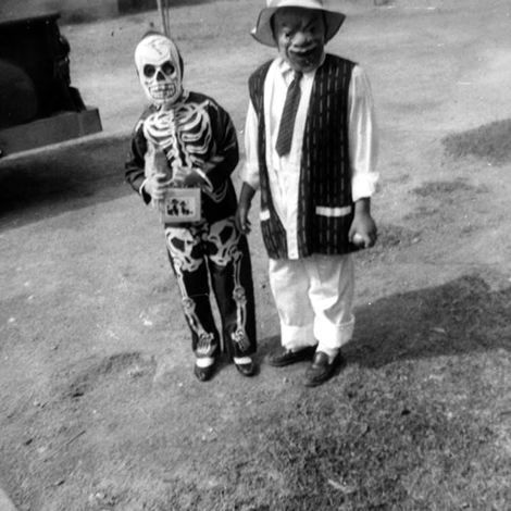 Boys in Halloween costumes. Gary in a skeleton suit along with a friend on Halloween on Graves Street in Monterey Park, [ca.1960]. Shades of L.A. Collection