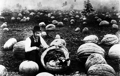 A man poses in 1903 with an open giant pumpkin, in which a calf lies curled up. The location is the Kellogg farm in Goleta. Photo credit: Sturtevant, Security Pacific National Bank Collection