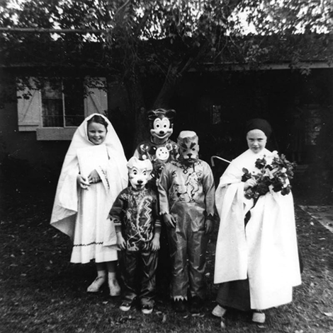 Linda and Mary Buckley, far left and far right, dressed as nuns and ready to trick-or-treat for Halloween in Panorama City, [1957]. Shades of L.A. Collection