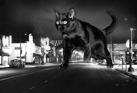 Photograph caption dated October 26, 1955 reads, "Black cat stalks Lankershim Boulevard in heart of North Hollywood as reminder of Halloween activities going on throughout Valley this weekend and Monday night, [1955]. Valley Times Collection