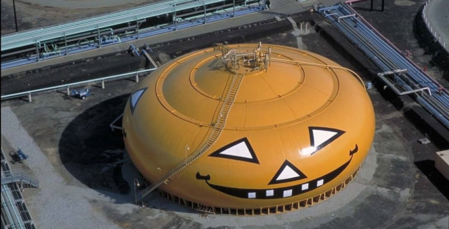 “For 358 nights of the year, the Great Pumpkin is an impostor. During all that time he assumes the identity of an 80,000-barrel spherical storage tank in the Union Oil Company’s south Los Angeles storage facility. But for the seven nights preceding Halloween, the Great Pumpkin shows his true colors. And they’re bright orange. We paint him that way with 40 gallons of paint. We paint his eyes, his nose, and his 73-foot wide toothy grin. We put lights all around him so that people can see him from a great distance. Especially little people.