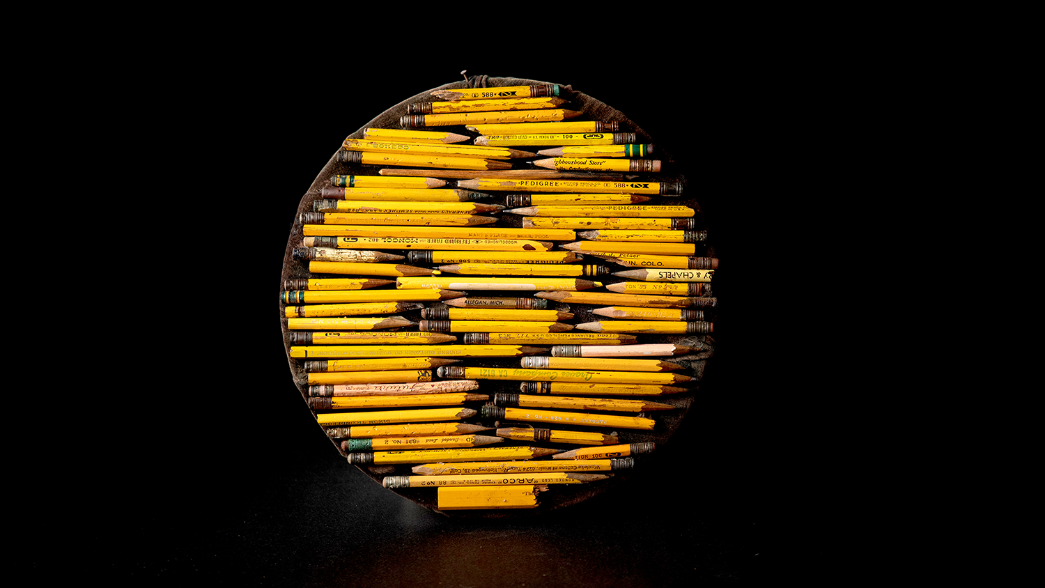 In 1956, at the age of 60, Tressa “Grandma” Prisbrey needed a place to store her collection of 17,000 pencils, many of which had been assembled into folk art pieces. Finding most building supplies too expensive, Prisbrey discovered a nearly endless supply of bottles at the local dump, and began building bottle houses on her property in Simi Valley. A selection of the pencil collages, not seen by the public since the early 1990s, has been restored for this exhibition.