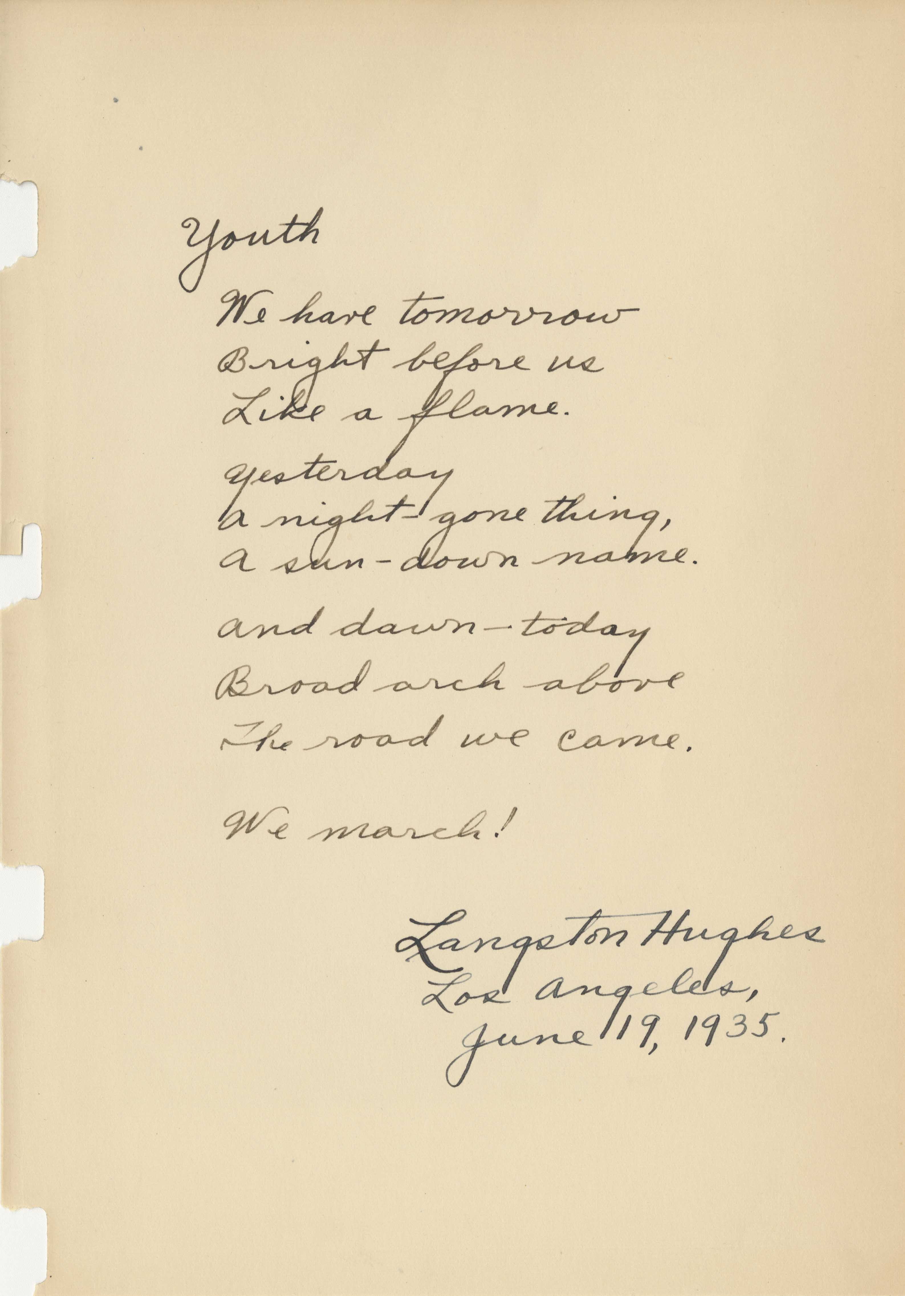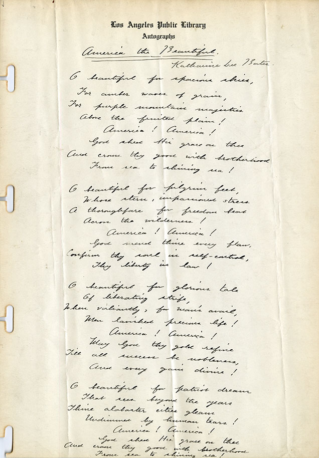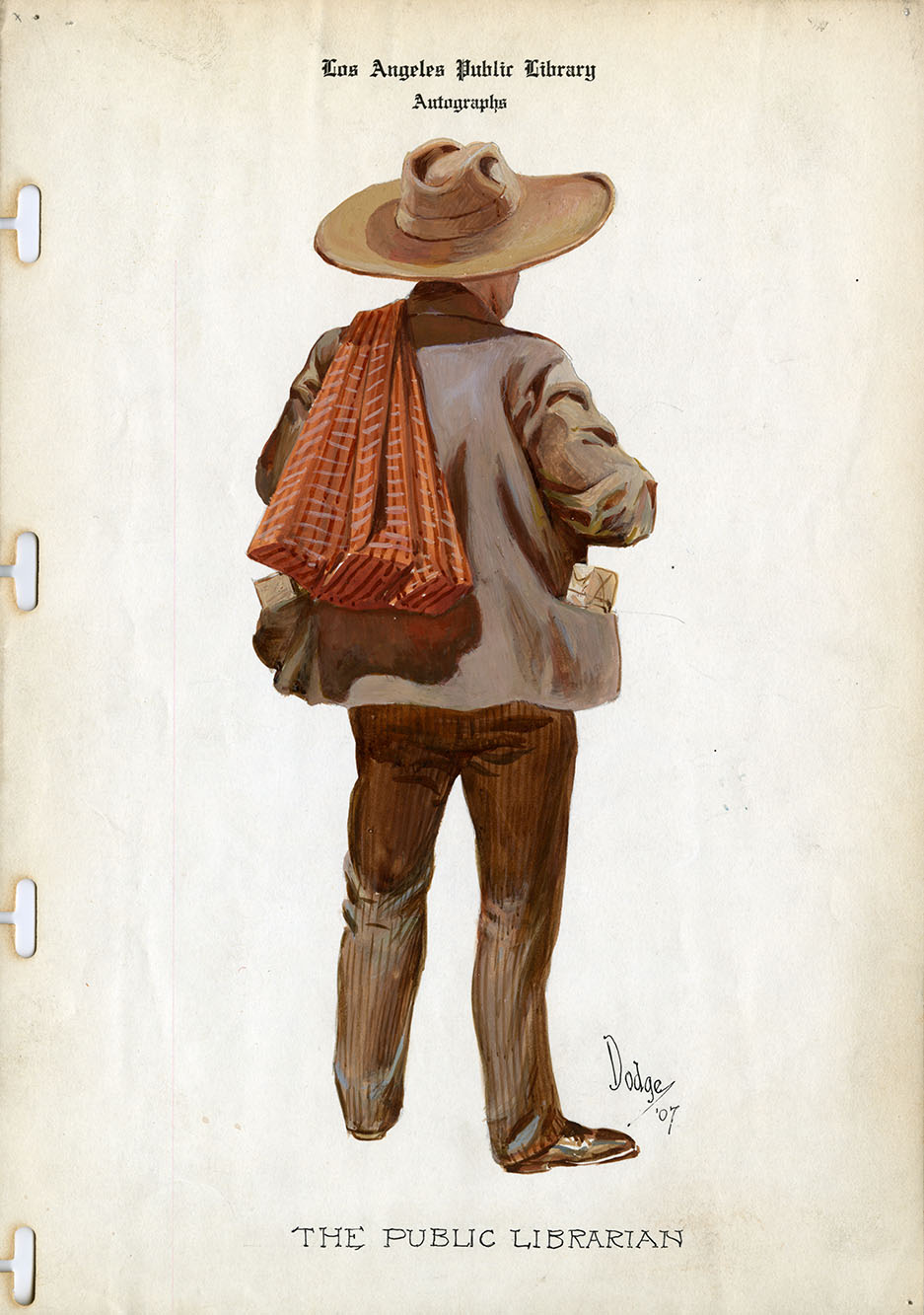 In 1906, City Librarian Charles Lummis initiated an Autograph Collection, soliciting hundreds of notable men and women from across the country to submit a representative expression or artwork to the Los Angeles Public Library’s permanent collection. Lummis sent blank stationery out with the call to “improve the enclosed page”, and received paintings, poems, speeches, and music from the likes of author L. Frank Baum, anthropologist Franz Boas, painter James Carol Beckwith, and “America the Beautiful” songwriter Katherine Lee Bates. The collection continued to grow intermittently after Lummis’ request, eventually adding pieces from Langston Hughes, Isaac Asimov, Helen Keller and many others.