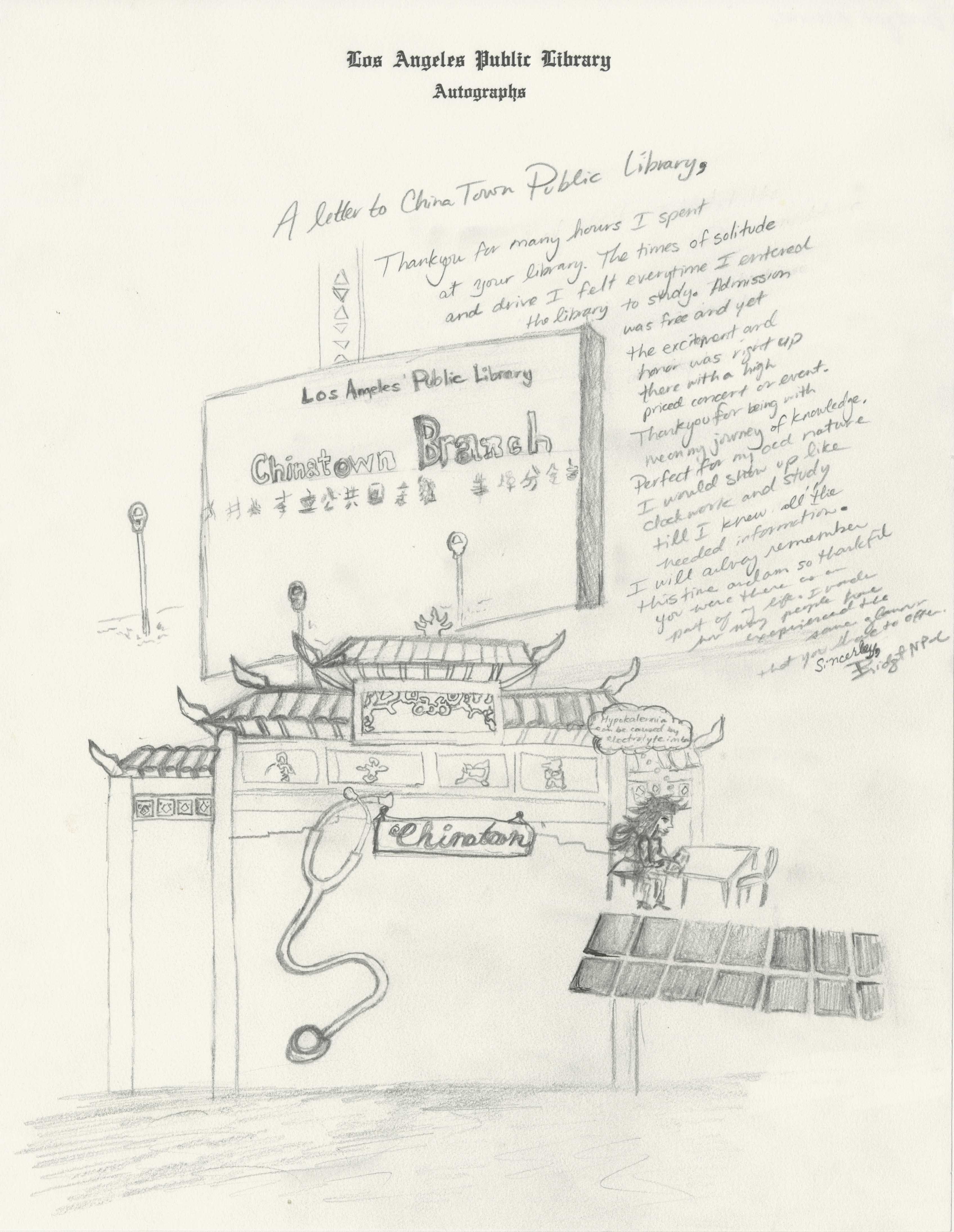 In 2018, City Librarian John F. Szabo expanded the collection further, inviting all Angelenos to add their names and drawings, poems or memories to the collection. This one-day event, Autograph Day, brought in 500 unique submissions from patrons at 19 branch libraries across the city, including the Stitchin’ Sistahz Quilt Circle, Skid Row artist Shugga, and 3 ½-year-old Abby Sanchez on her first visit to the library. An appeal to the artists, writers and thinkers of today resulted in further submissions from the likes of Roy Choi, Patt Morrison, Cheech Marin, Norman Lear and many more. The Autograph Collection now numbers more than 1700 pieces.