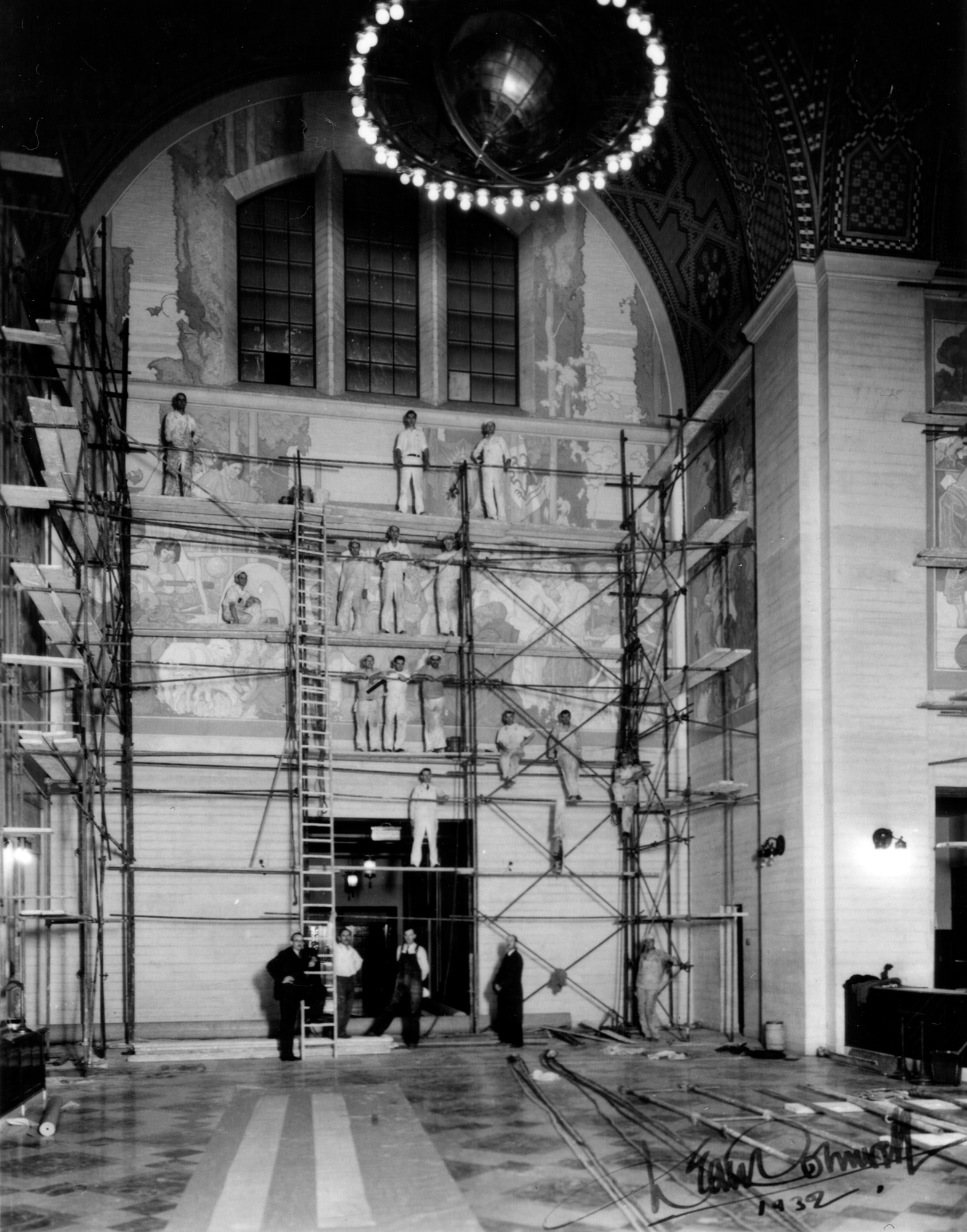 The statue of Civilization is shown under assembly, prior to being moved to Central Library for installation in 1930