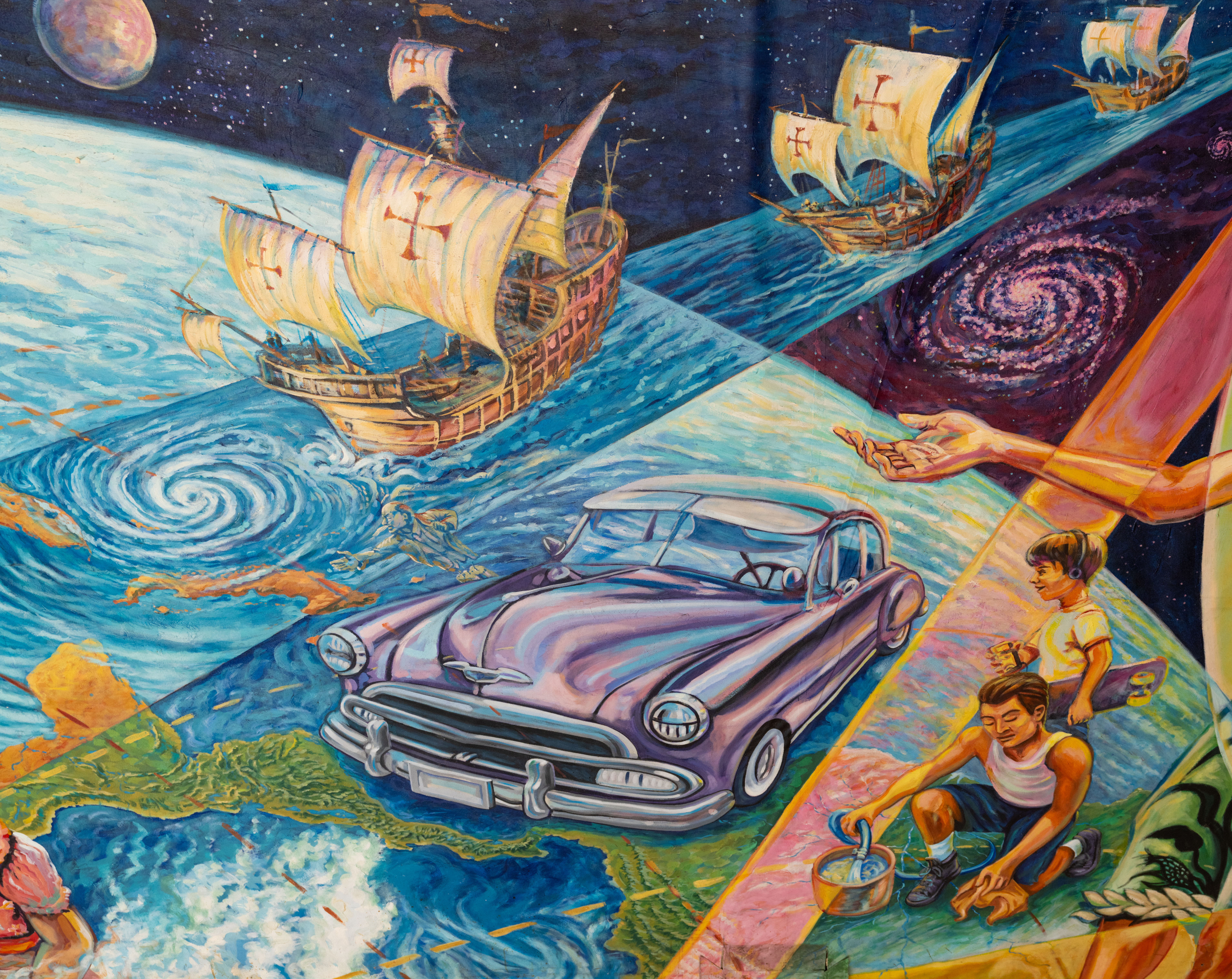 On view for the first time in 25 years, the 65 foot long mural on canvas Hacia Al Norte (1991) captures the spirit of immigrant stories of Angelenos from Latin America, Asia, and Europe. Spanish galleons cross the ocean, Mexico City’s Zócalo buzzes with traffic, Mayan temples rise from the jungle of the Yucatan, and a boy learns to use chopsticks from a new friend.