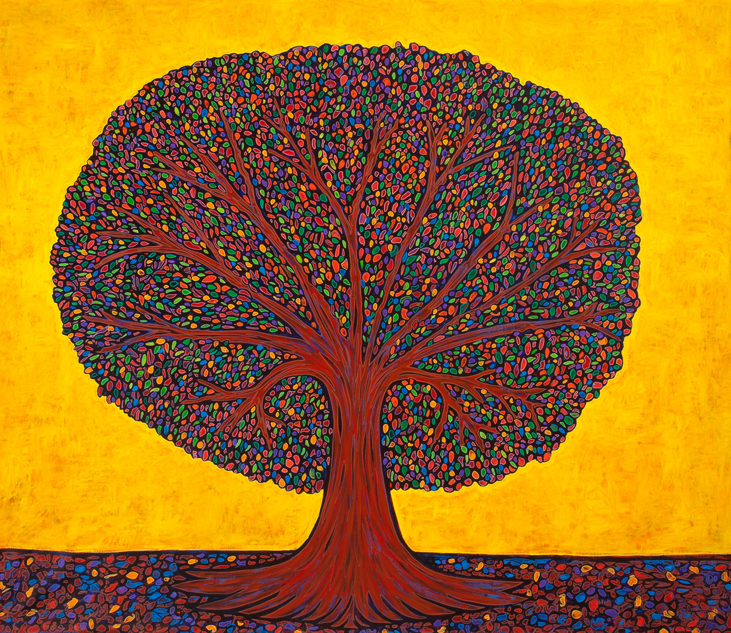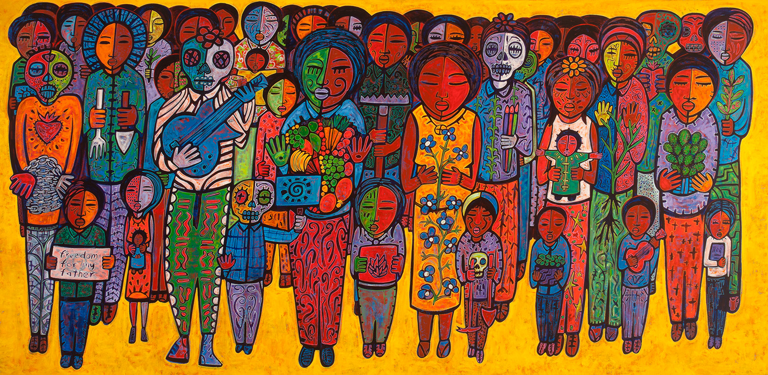 Con un entusiasmo sobre y para la gente, las obras de Ramirez pueden ser sorprendentemente simples o complejas y desconcertantes, cautivando a los espectadores con composiciones audaces, formas estilizadas y colores primarios vibrantes. El artista a menudo comienza un lienzo con dibujos lineales modestos, construyendo lentamente el trabajo final sobre capas de pintura oscura, superponiendo brillantes pigmentos y contornos de color púrpura oscuro. A menudo expone sus lienzos más grandes sin tensar, dándoles la sensación de ricos tapices narrativos. Fijados a la pared simplemente con clavos, parecen apariciones fugaces de una especie de sueño que hacen recordar el realismo mágico de escritores latinoamericanos como Gabriel García Márquez, Jorge Luis Borges o Laura Esquivel. Las pinturas también brindan enlaces fértiles a la poesía del dramaturgo puertorriqueño Miguel Piñero y del hombre de letras uruguayo Eduardo Galeano, quien una vez exclamó que estaba “obsesionado con recordar, a recordar el pasado de América, sobre todo, y sobre todo la de América Latina, la tierra íntima condenada a la amnesia”.